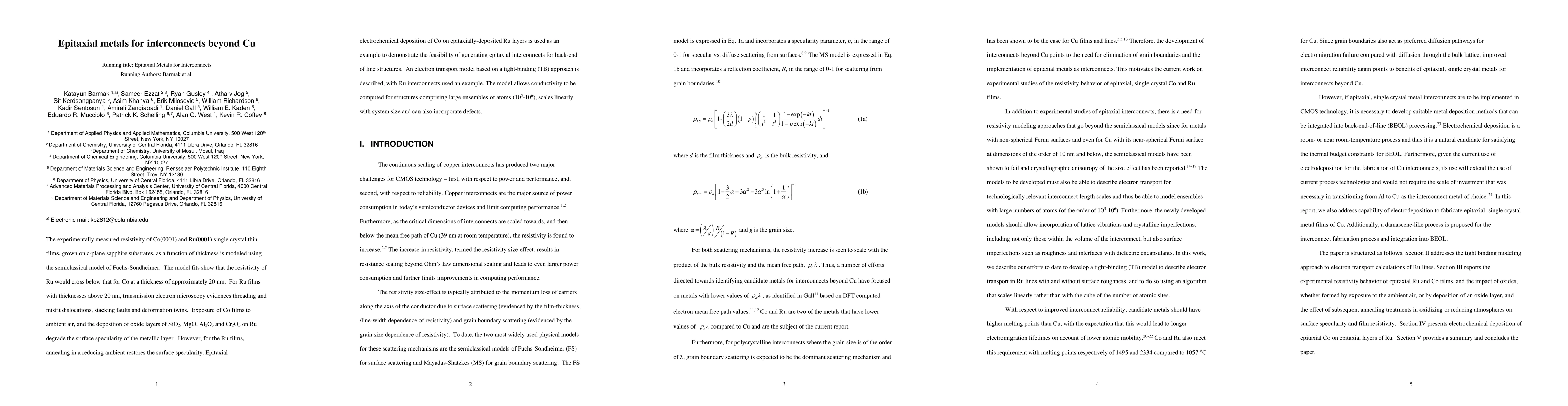 The experimentally measured resistivity of Co(0001) and Ru(0001) single crystal thin films, grown on c-plane sapphire substrates, as a function of thickness is modeled using the semiclassical model of Fuchs-Sondheimer. The model fits show that the resistivity of Ru would cross below that for Co at a thickness of approximately 20 nm. For Ru films with thicknesses above 20 nm, transmission electron microscopy evidences threading and misfit dislocations, stacking faults and deformation twins. Exposure of Co films to ambient air, and the deposition of oxide layers of SiO2, MgO, Al2O3 and Cr2O3 on Ru degrade the surface specularity of the metallic layer. However, for the Ru films, annealing in a reducing ambient restores the surface specularity. Epitaxial electrochemical deposition of Co on epitaxially-deposited Ru layers is used as an example to demonstrate the feasibility of generating epitaxial interconnects for back-end of line structures. An electron transport model based on a tight-binding approach is described, with Ru interconnects used an example. The model allows conductivity to be computed for structures comprising large ensembles of atoms (10^5-10^6), scales linearly with system size and can also incorporate defects.