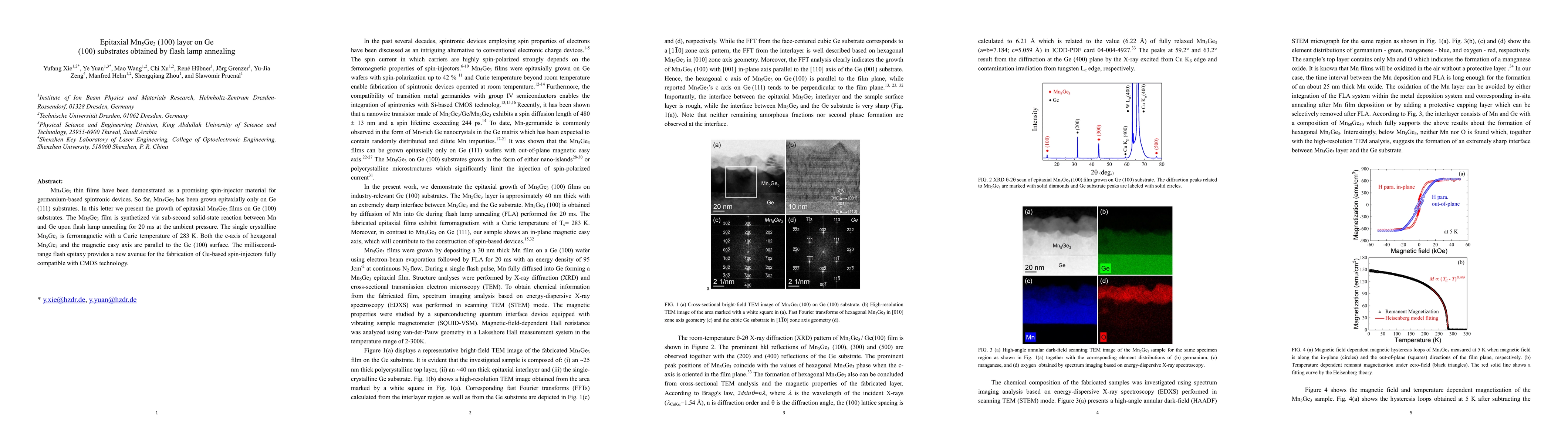 This paper reports the successful epitaxial growth of Mn5Ge3 thin films on Ge (100) substrates using flash lamp annealing, marking the first time this material has been grown on Ge (100). The technique enables the fabrication of spin-injectors compatible with CMOS technology.