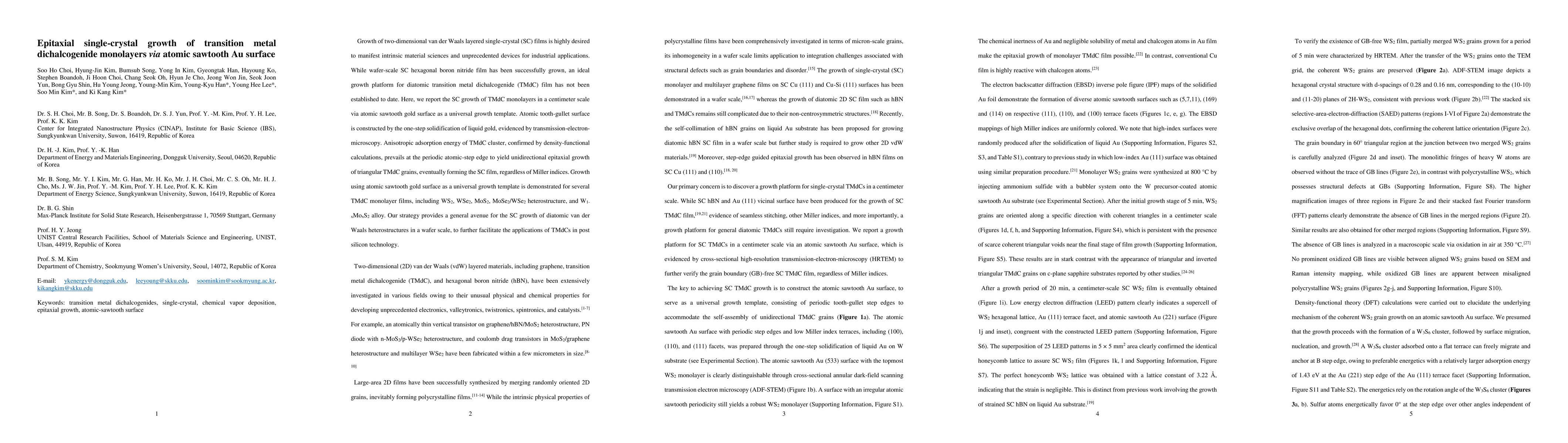 This paper reports the successful growth of centimeter-scale single-crystal monolayers of transition metal dichalcogenides (TMdC) using an atomic sawtooth gold surface as a universal growth template. The method enables the epitaxial growth of various TMdC films, including WS2, WSe2, MoS2, and heterostructures, paving the way for advanced applications in post-silicon technology.