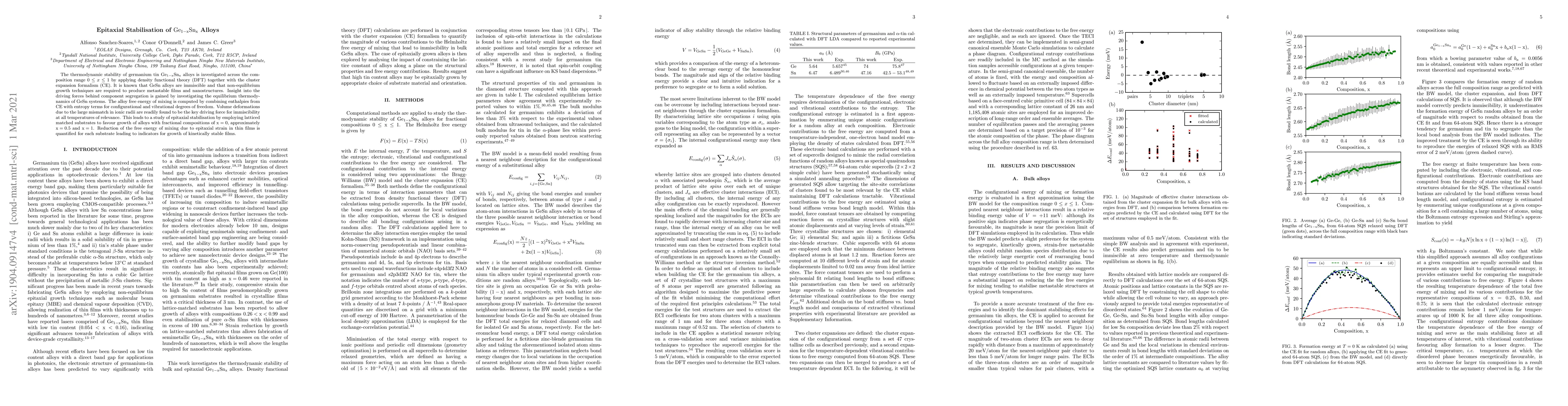The thermodynamic stability of germanium tin $\mathrm{Ge_{1-x}Sn_x}$ alloys is investigated across the composition range $0 \le x \le 1$ by applying density functional theory (DFT) together with the cluster expansion formalism (CE). It is known that GeSn alloys are immiscible and that non-equilibrium growth techniques are required to produce metastable films and nanostructures. Insight into the driving forces behind component segregation is gained by investigating the equilibrium thermodynamics of GeSn systems. The alloy free energy of mixing is computed by combining enthalpies from CE with entropy terms for configurational and vibrational degrees of freedom. Volume deformations due to the large mismatch in ionic radii are readily found to be the key driving force for immiscibility at all temperatures of relevance. This leads to a study of epitaxial stabilisation by employing latticed matched substrates to favour growth of alloys with fractional compositions of $\mathrm{x=0}$, approximately $\mathrm{x=0.5}$ and $\mathrm{x=1}$. Reduction of the free energy of mixing due to epitaxial strain in thin films is quantified for each substrate leading to indicators for growth of kinetically stable films.