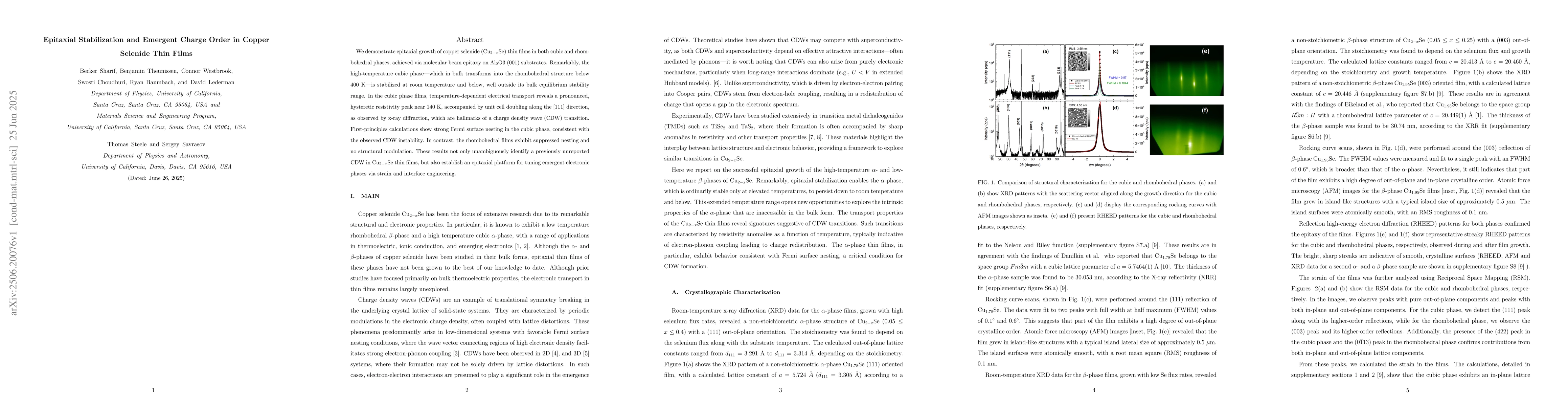 We demonstrate epitaxial growth of copper selenide (Cu$_{2-x}$Se) thin films in both cubic and rhombohedral phases, achieved via molecular beam epitaxy on Al$_2$O$_3$ (001) substrates. Remarkably, the high-temperature cubic phase -- which in bulk transforms into the rhombohedral structure below 400 K -- is stabilized at room temperature and below, well outside its bulk equilibrium stability range. In the cubic phase films, temperature-dependent electrical transport reveals a pronounced, hysteretic resistivity peak near 140 K, accompanied by unit cell doubling along the [111] direction, as observed by x-ray diffraction, which are hallmarks of a charge density wave (CDW) transition. First-principles calculations show strong Fermi surface nesting in the cubic phase, consistent with the observed CDW instability. In contrast, the rhombohedral films exhibit suppressed nesting and no structural modulation. These results not only unambiguously identify a previously unreported CDW in Cu$_{2-x}$Se thin films, but also establish an epitaxial platform for tuning emergent electronic phases via strain and interface engineering.