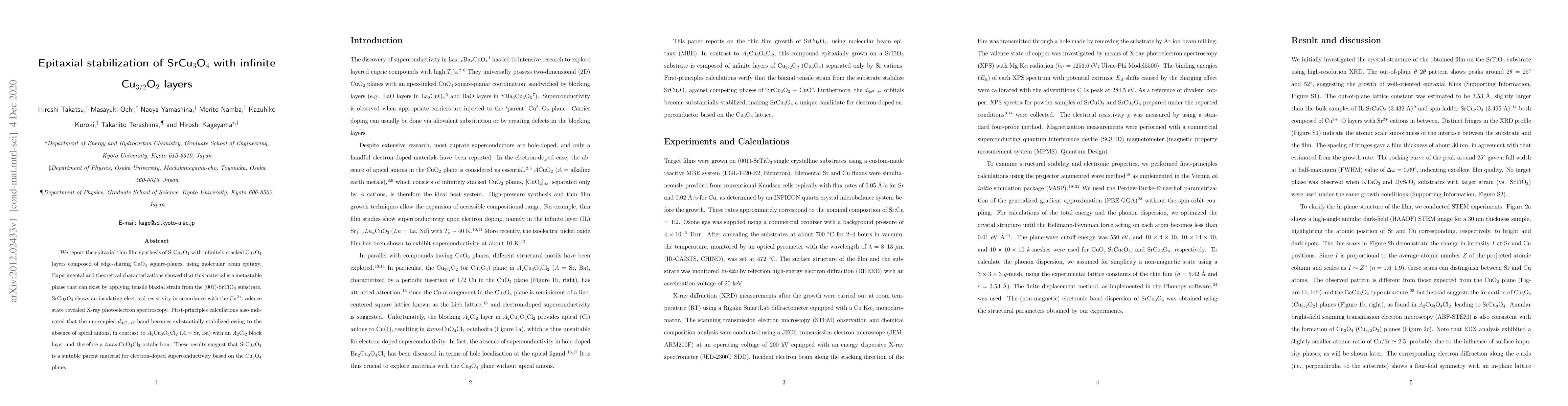 SrCu$_3$O$_4$ thin films with infinite Cu$_{3/2}$O$_2$ layers were synthesized epitaxially using molecular beam epitaxy. The material is metastable and stabilized by tensile strain, exhibiting insulating behavior and a unique electronic structure due to the absence of apical anions.