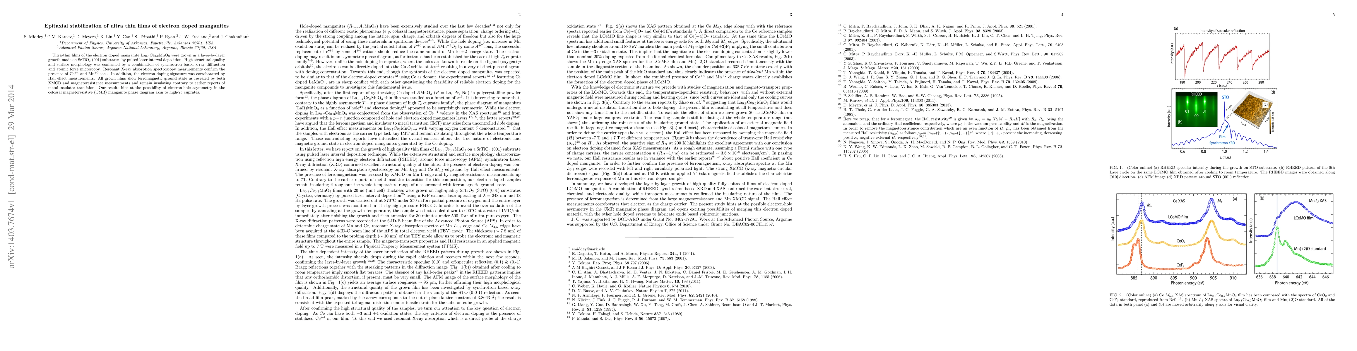 This study details the epitaxial growth of ultra-thin films of electron-doped manganite La$_{0.8}$Ce$_{0.2}$MnO$_3$ on SrTiO$_3$ using pulsed laser deposition, revealing high structural quality and ferromagnetic ground state. Contrary to previous reports, the films remain insulating, suggesting electron-hole asymmetry in the manganite phase diagram.