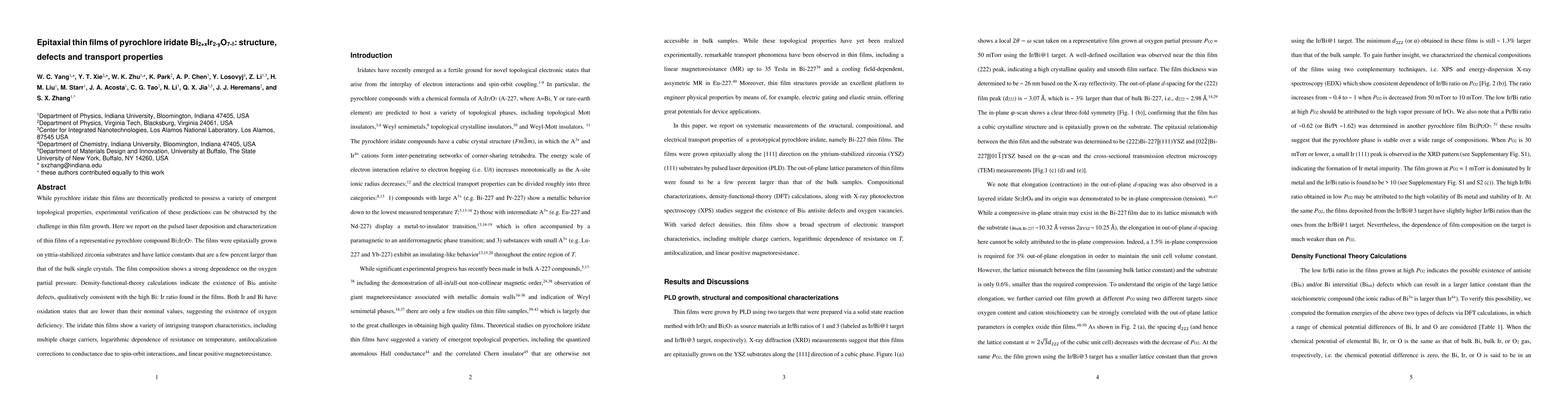 This paper reports on the epitaxial growth of pyrochlore iridate Bi2Ir2O7 thin films via pulsed laser deposition, revealing structural defects and unusual transport properties such as multiple charge carriers and logarithmic resistance dependence. The films exhibit Bi-Ir antisite defects and oxygen deficiency, influencing their electronic behavior.