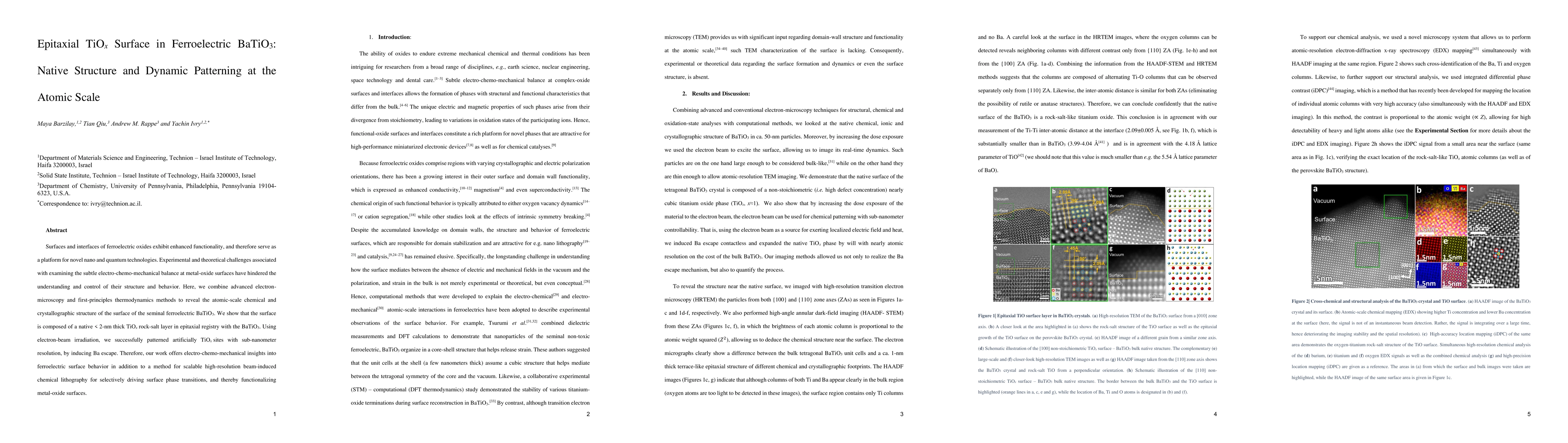 This paper reveals the atomic-scale structure of the ferroelectric BaTiO3 surface, showing it consists of a native TiOx layer, and demonstrates a method for high-resolution electron-beam induced chemical lithography to pattern TiOx sites, offering new insights into ferroelectric surface behavior and potential for surface functionalization.