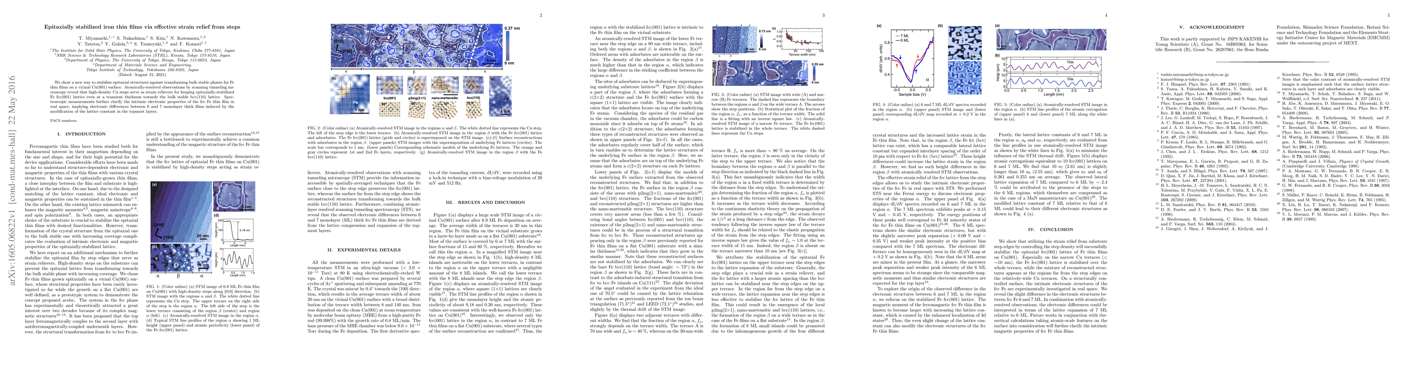 This paper presents a novel method to stabilize epitaxial iron thin films on a vicinal Cu(001) surface by utilizing high-density Cu steps to relieve strain, maintaining the fcc(001) lattice structure even as the film approaches bulk stable bcc(110) phase. Spectroscopic measurements reveal distinct electronic properties in 6 and 7 monolayer thick films due to lattice constant modifications in the topmost layers.