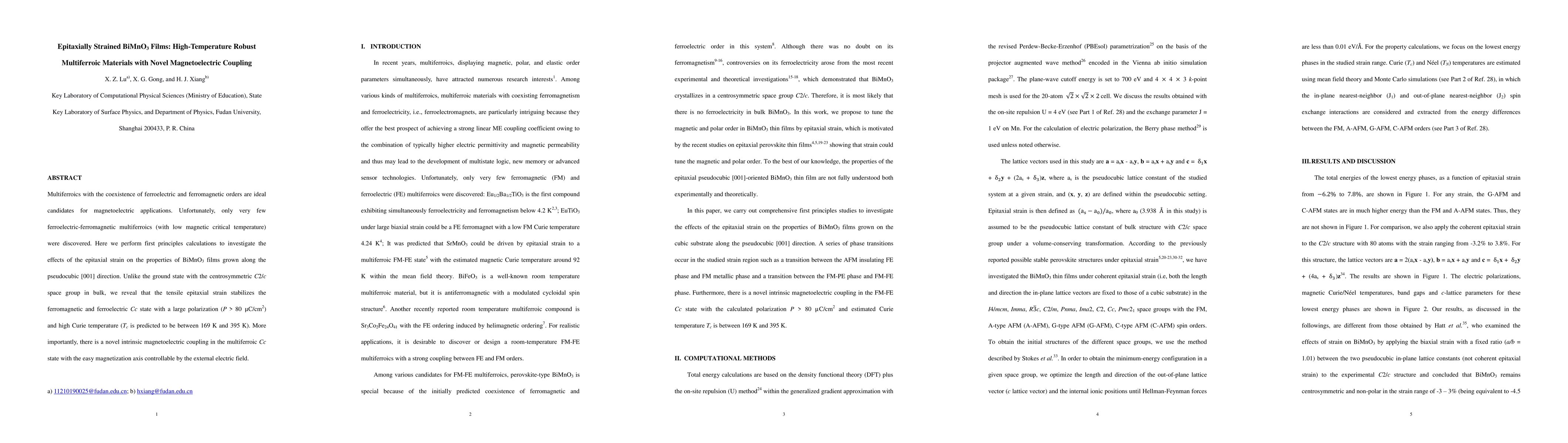 This study investigates epitaxially strained BiMnO3 films, revealing that tensile strain stabilizes a high-temperature ferromagnetic and ferroelectric state with a large polarization and Curie temperature. The research highlights a novel intrinsic magnetoelectric coupling, enabling control of the magnetization axis via external electric fields.