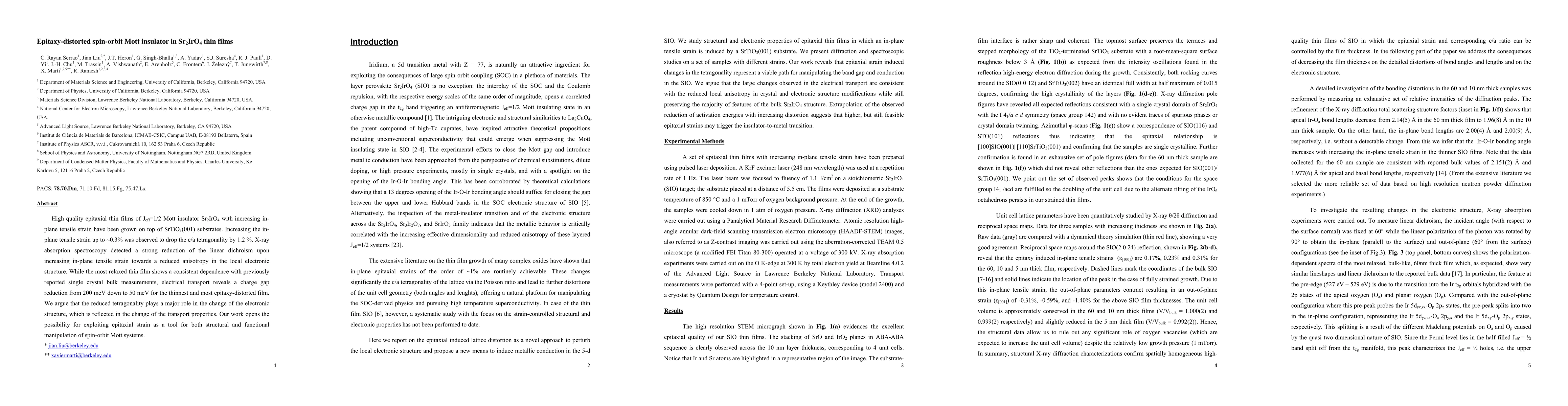 This study investigates the effects of epitaxial strain on the electronic structure of Sr2IrO4 thin films, revealing a reduction in tetragonality and anisotropy, and a significant decrease in the charge gap with increased strain, suggesting potential for strain-induced functional manipulation in spin-orbit Mott insulators.