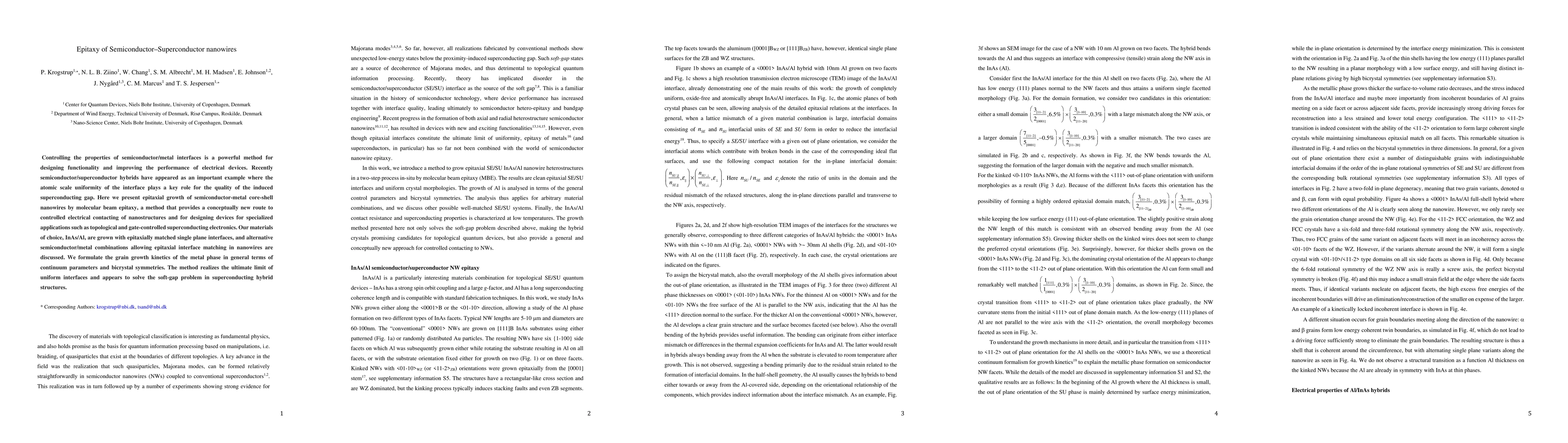 This paper details the epitaxial growth of semiconductor-superconductor nanowires using molecular beam epitaxy, achieving atomic scale uniformity in interfaces crucial for inducing superconducting gaps. The method enables the design of specialized devices for topological and gate-controlled superconducting electronics.