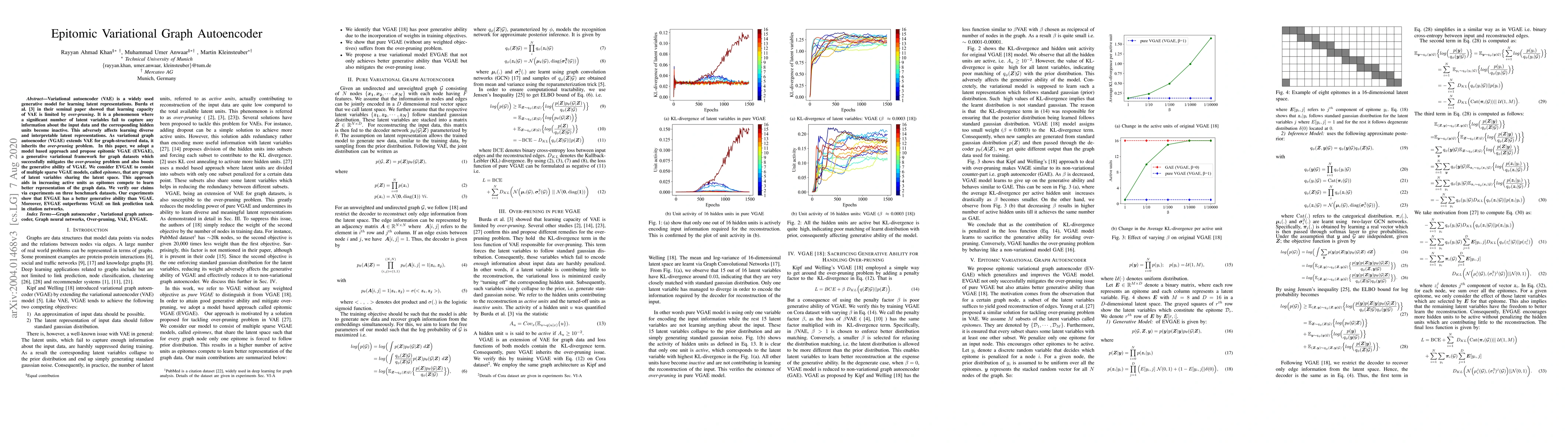 The paper proposes Epitomic Variational Graph Autoencoder (EVGAE) to address over-pruning in Variational Graph Autoencoders (VGAE), enhancing generative ability and performance in link prediction tasks. EVGAE uses multiple sparse VGAE models, called epitomes, to increase active latent units and improve representation learning.