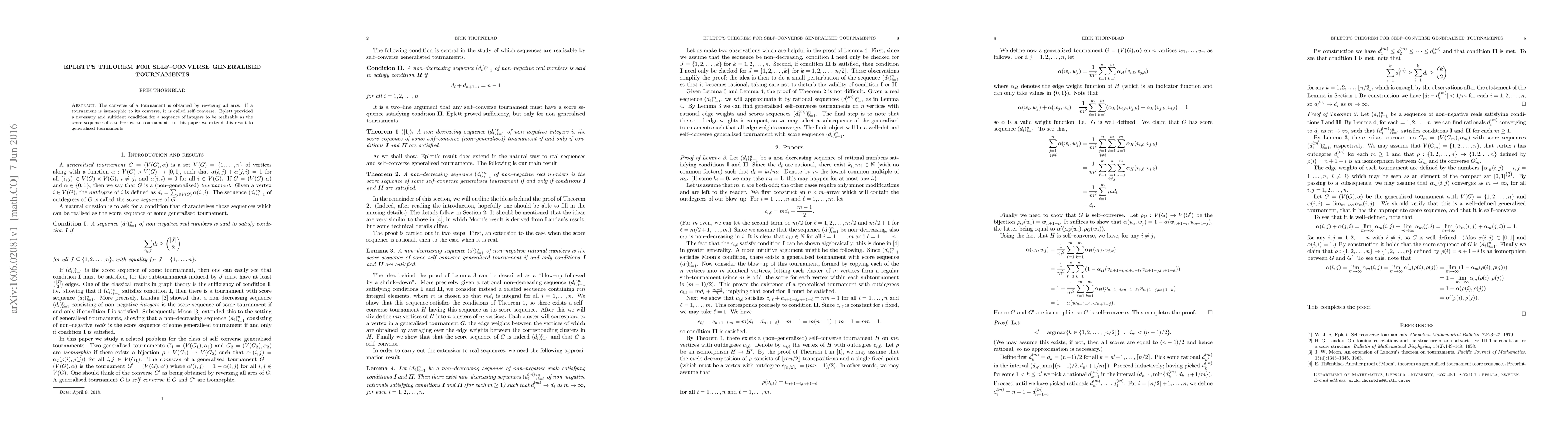 The converse of a tournament is obtained by reversing all arcs. If a tournament is isomorphic to its converse, it is called self--converse. Eplett provided a necessary and sufficient condition for a sequence of integers to be realisable as the score sequence of a self--converse tournament. In this paper we extend this result to generalised tournaments.