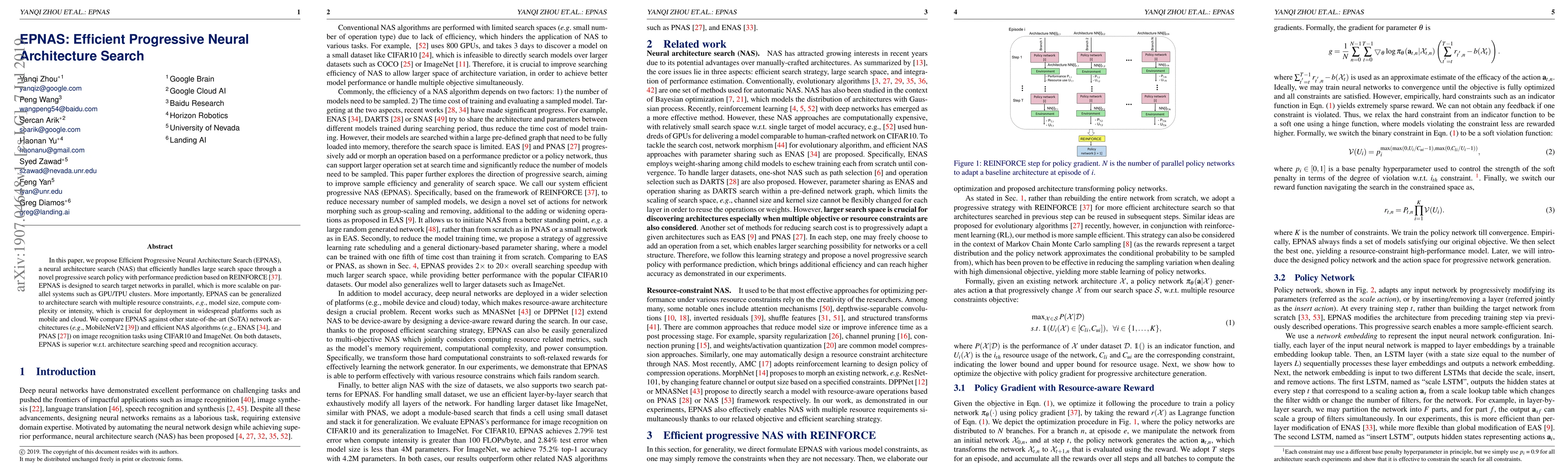 In this paper, we propose Efficient Progressive Neural Architecture Search (EPNAS), a neural architecture search (NAS) that efficiently handles large search space through a novel progressive search policy with performance prediction based on REINFORCE~\cite{Williams.1992.PG}. EPNAS is designed to search target networks in parallel, which is more scalable on parallel systems such as GPU/TPU clusters. More importantly, EPNAS can be generalized to architecture search with multiple resource constraints, \eg, model size, compute complexity or intensity, which is crucial for deployment in widespread platforms such as mobile and cloud. We compare EPNAS against other state-of-the-art (SoTA) network architectures (\eg, MobileNetV2~\cite{mobilenetv2}) and efficient NAS algorithms (\eg, ENAS~\cite{pham2018efficient}, and PNAS~\cite{Liu2017b}) on image recognition tasks using CIFAR10 and ImageNet. On both datasets, EPNAS is superior \wrt architecture searching speed and recognition accuracy.