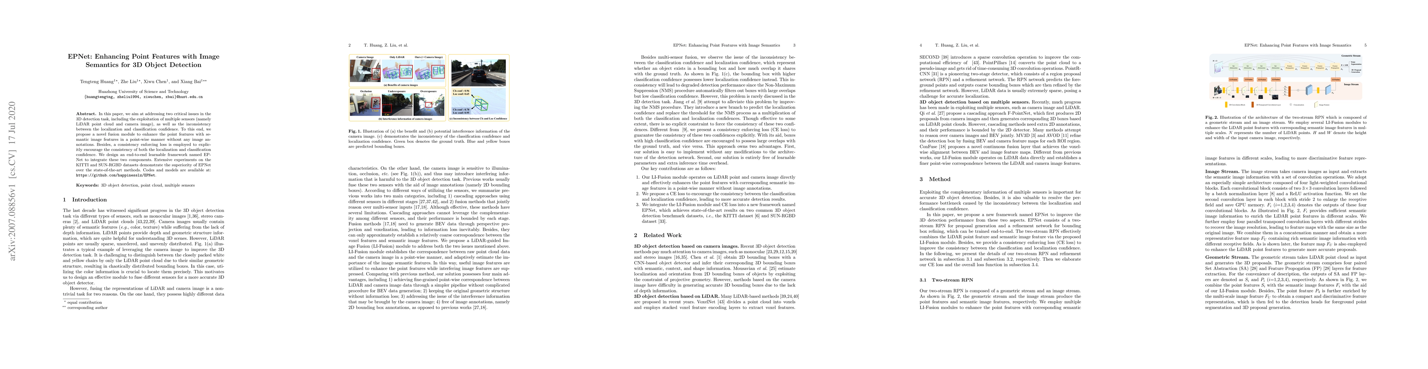 In this paper, we aim at addressing two critical issues in the 3D detection task, including the exploitation of multiple sensors~(namely LiDAR point cloud and camera image), as well as the inconsistency between the localization and classification confidence. To this end, we propose a novel fusion module to enhance the point features with semantic image features in a point-wise manner without any image annotations. Besides, a consistency enforcing loss is employed to explicitly encourage the consistency of both the localization and classification confidence. We design an end-to-end learnable framework named EPNet to integrate these two components. Extensive experiments on the KITTI and SUN-RGBD datasets demonstrate the superiority of EPNet over the state-of-the-art methods. Codes and models are available at: \url{https://github.com/happinesslz/EPNet}.