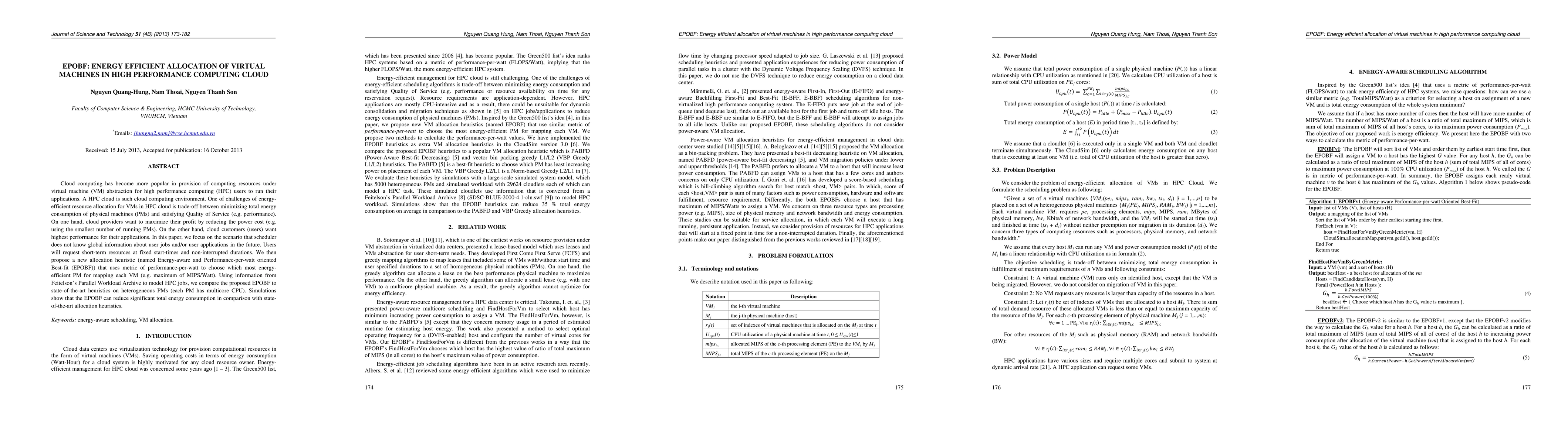 This paper proposes the EPOBF heuristic for energy-efficient virtual machine allocation in high performance computing clouds, aiming to minimize energy consumption while maintaining performance. Simulations demonstrate that EPOBF significantly reduces total energy consumption compared to existing heuristics.