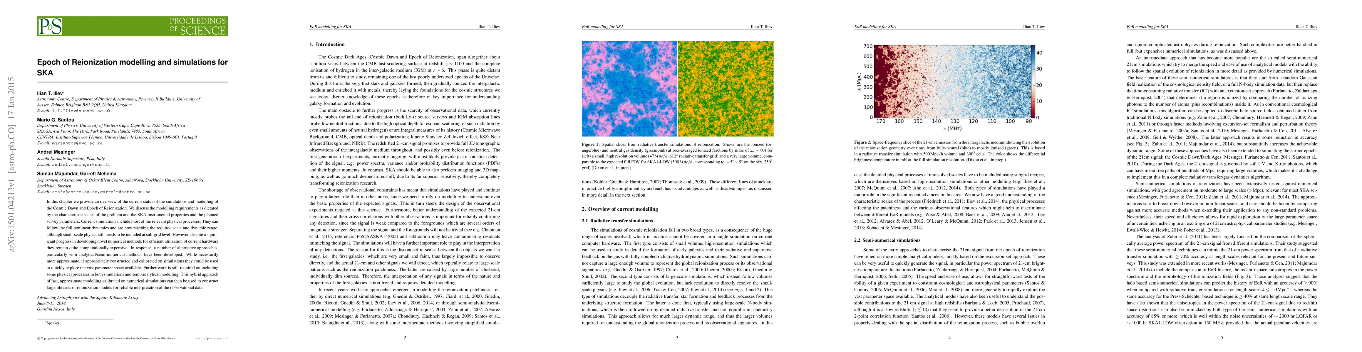 In this chapter we provide an overview of the current status of the simulations and modelling of the Cosmic Dawn and Epoch of Reionization. We discuss the modelling requirements as dictated by the characteristic scales of the problem and the SKA instrumental properties and the planned survey parameters. Current simulations include most of the relevant physical processes. They can follow the full nonlinear dynamics and are now reaching the required scale and dynamic range, although small-scale physics still needs to be included at sub-grid level. However, despite a significant progress in developing novel numerical methods for efficient utilization of current hardware they remain quite computationally expensive. In response, a number of alternative approaches, particularly semi-analytical/semi-numerical methods, have been developed. While necessarily more approximate, if appropriately constructed and calibrated on simulations they could be used to quickly explore the vast parameter space available. Further work is still required on including some physical processes in both simulations and semi-analytical modelling. This hybrid approach of fast, approximate modelling calibrated on numerical simulations can then be used to construct large libraries of reionization models for reliable interpretation of the observational data.