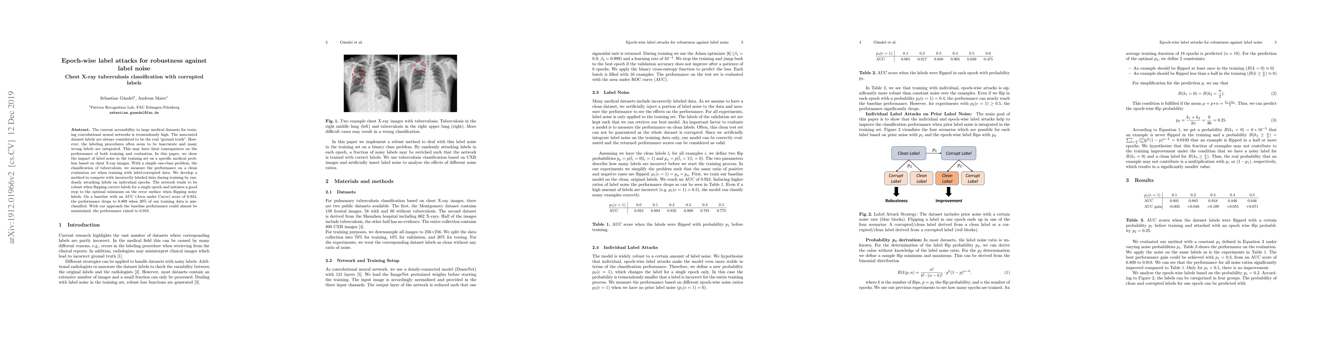 This paper investigates the impact of label noise in medical image datasets, specifically chest X-rays for tuberculosis classification. It introduces an epoch-wise label attack method during training to counteract noisy labels, maintaining high AUC scores even with 30% mislabeled data, from a baseline of 0.924 to 0.918.