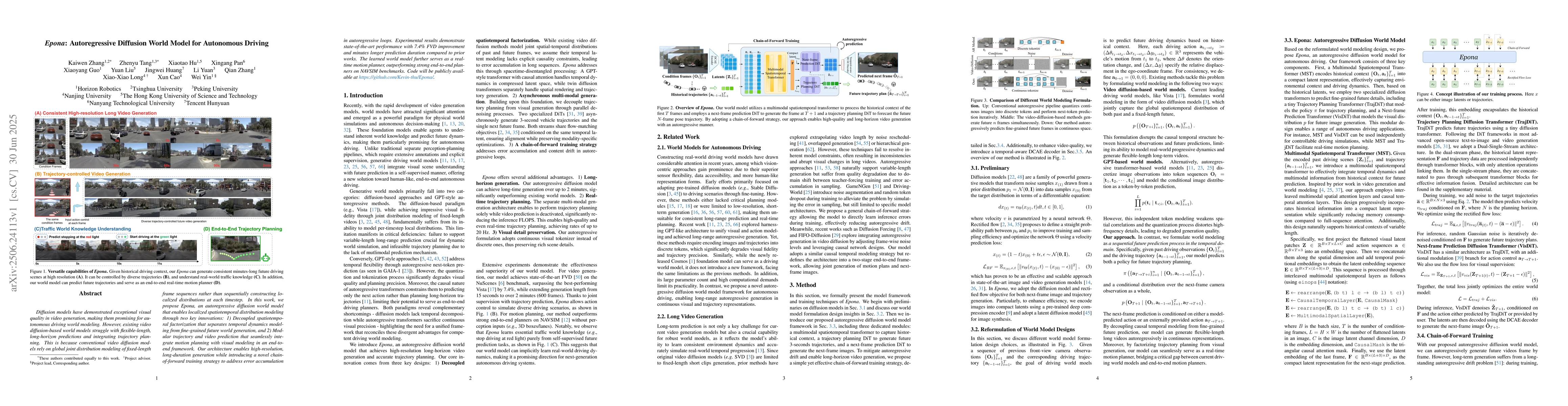 Epona introduces decoupled spatiotemporal factorization and modular trajectory and video prediction, enabling high-resolution, long-duration generation with a novel chain-of-forward training strategy to mitigate error accumulation in autoregressive loops.