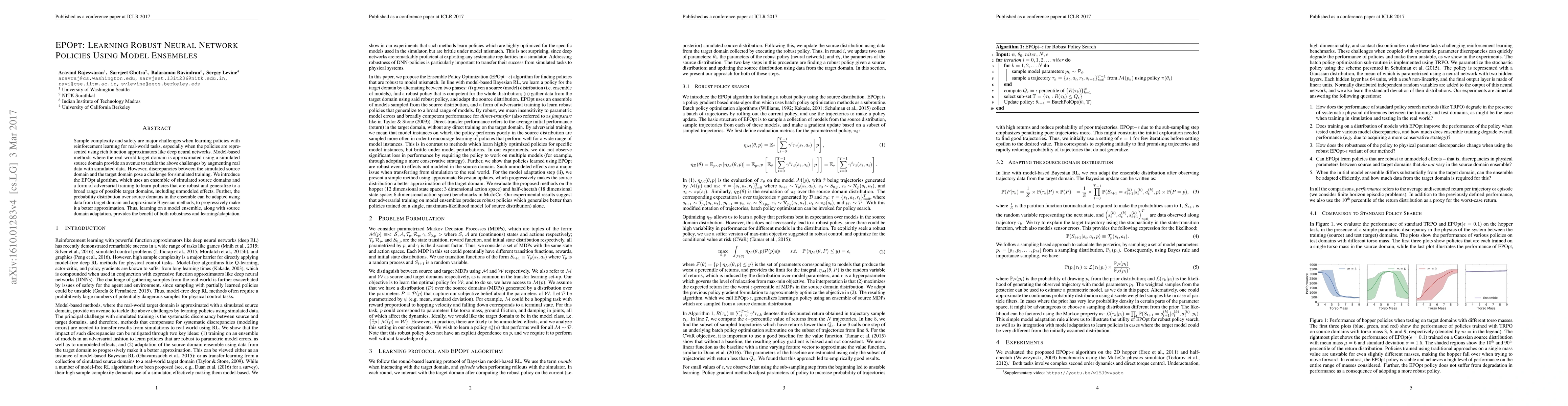 EPOpt, an algorithm for training robust policies using model ensembles and adversarial training, providing a method to learn policies that generalize well to a broad range of target domains, including unmodeled effects.