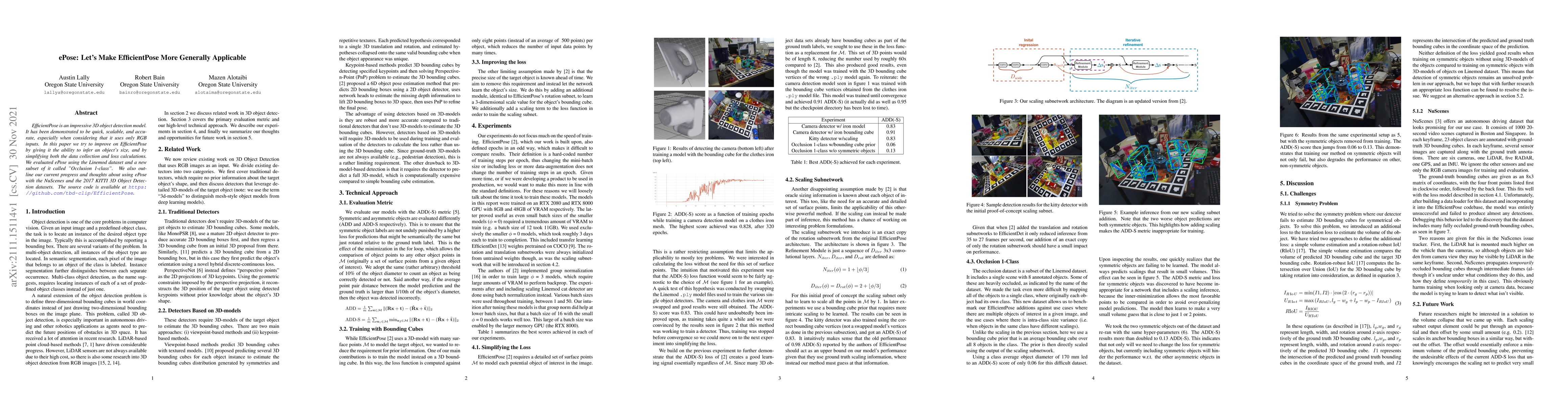 EfficientPose is an impressive 3D object detection model. It has been demonstrated to be quick, scalable, and accurate, especially when considering that it uses only RGB inputs. In this paper we try to improve on EfficientPose by giving it the ability to infer an object's size, and by simplifying both the data collection and loss calculations. We evaluated ePose using the Linemod dataset and a new subset of it called "Occlusion 1-class". We also outline our current progress and thoughts about using ePose with the NuScenes and the 2017 KITTI 3D Object Detection datasets. The source code is available at https://github.com/tbd-clip/EfficientPose.