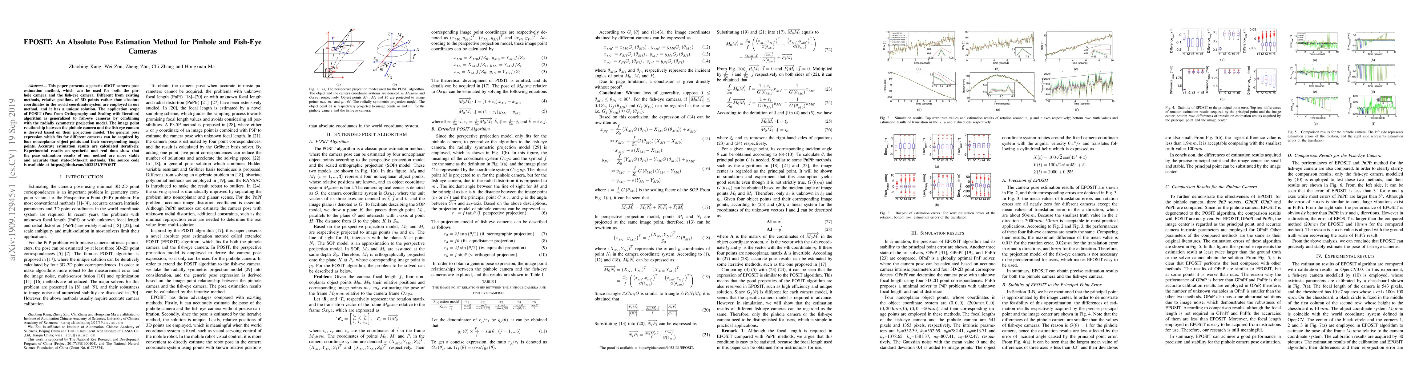 This paper introduces EPOSIT, a novel 6DOF camera pose estimation method for both pinhole and fish-eye cameras, utilizing relative 3D point positions for a unique solution. The POSIT algorithm is generalized for fish-eye cameras, achieving more stable and accurate results compared to existing methods.