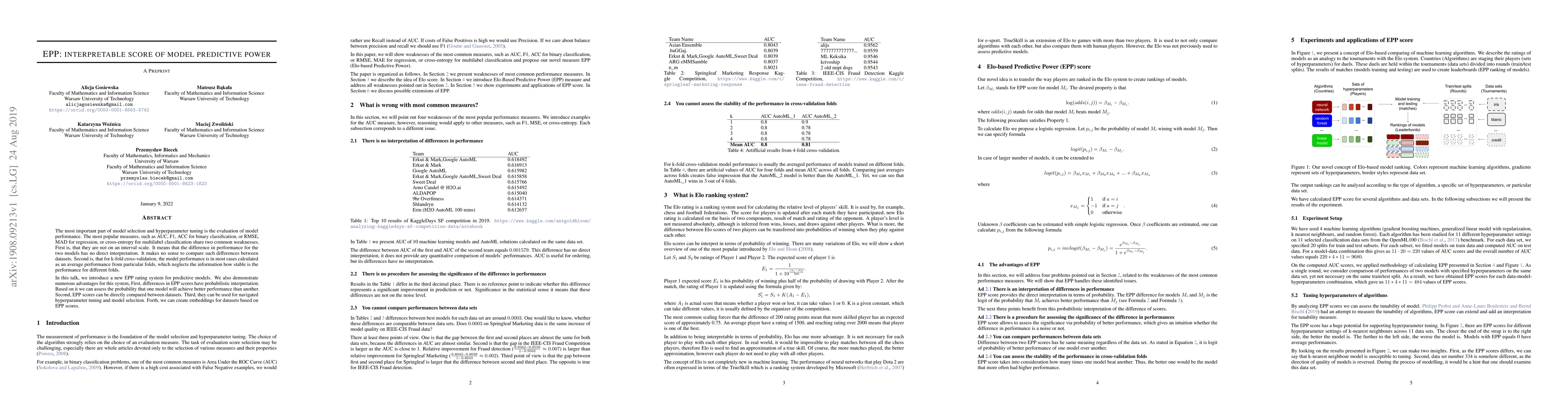 The most important part of model selection and hyperparameter tuning is the evaluation of model performance. The most popular measures, such as AUC, F1, ACC for binary classification, or RMSE, MAD for regression, or cross-entropy for multilabel classification share two common weaknesses. First is, that they are not on an interval scale. It means that the difference in performance for the two models has no direct interpretation. It makes no sense to compare such differences between datasets. Second is, that for k-fold cross-validation, the model performance is in most cases calculated as an average performance from particular folds, which neglects the information how stable is the performance for different folds. In this talk, we introduce a new EPP rating system for predictive models. We also demonstrate numerous advantages for this system, First, differences in EPP scores have probabilistic interpretation. Based on it we can assess the probability that one model will achieve better performance than another. Second, EPP scores can be directly compared between datasets. Third, they can be used for navigated hyperparameter tuning and model selection. Forth, we can create embeddings for datasets based on EPP scores.