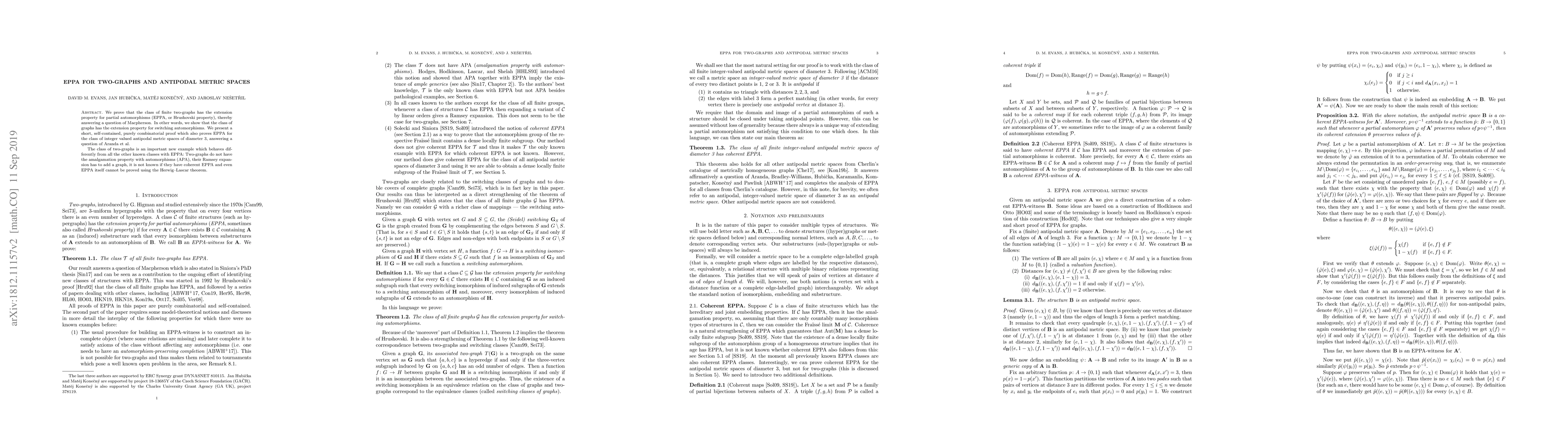 We prove that the class of finite two-graphs has the extension property for partial automorphisms (EPPA, or Hrushovski property), thereby answering a question of Macpherson. In other words, we show that the class of graphs has the extension property for switching automorphisms. We present a short, self-contained, purely combinatorial proof which also proves EPPA for the class of integer valued antipodal metric spaces of diameter 3, answering a question of Aranda et al. The class of two-graphs is an important new example which behaves differently from all the other known classes with EPPA: Two-graphs do not have the amalgamation property with automorphisms (APA), their Ramsey expansion has to add a graph, it is not known if they have coherent EPPA and even EPPA itself cannot be proved using the Herwig--Lascar theorem.