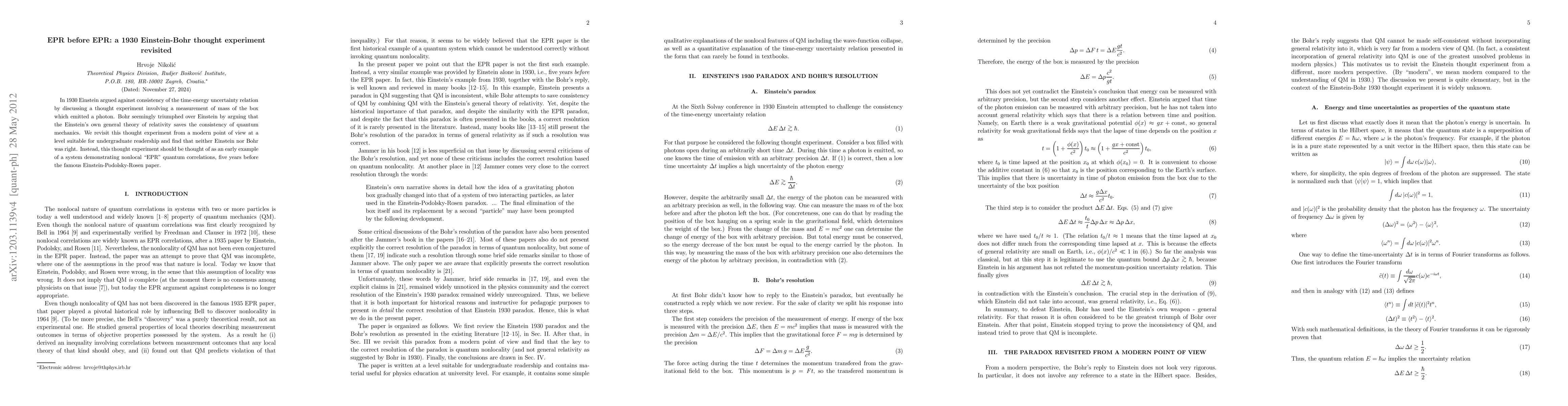 In 1930 Einstein argued against consistency of the time-energy uncertainty relation by discussing a thought experiment involving a measurement of mass of the box which emitted a photon. Bohr seemingly triumphed over Einstein by arguing that the Einstein's own general theory of relativity saves the consistency of quantum mechanics. We revisit this thought experiment from a modern point of view at a level suitable for undergraduate readership and find that neither Einstein nor Bohr was right. Instead, this thought experiment should be thought of as an early example of a system demonstrating nonlocal "EPR" quantum correlations, five years before the famous Einstein-Podolsky-Rosen paper.