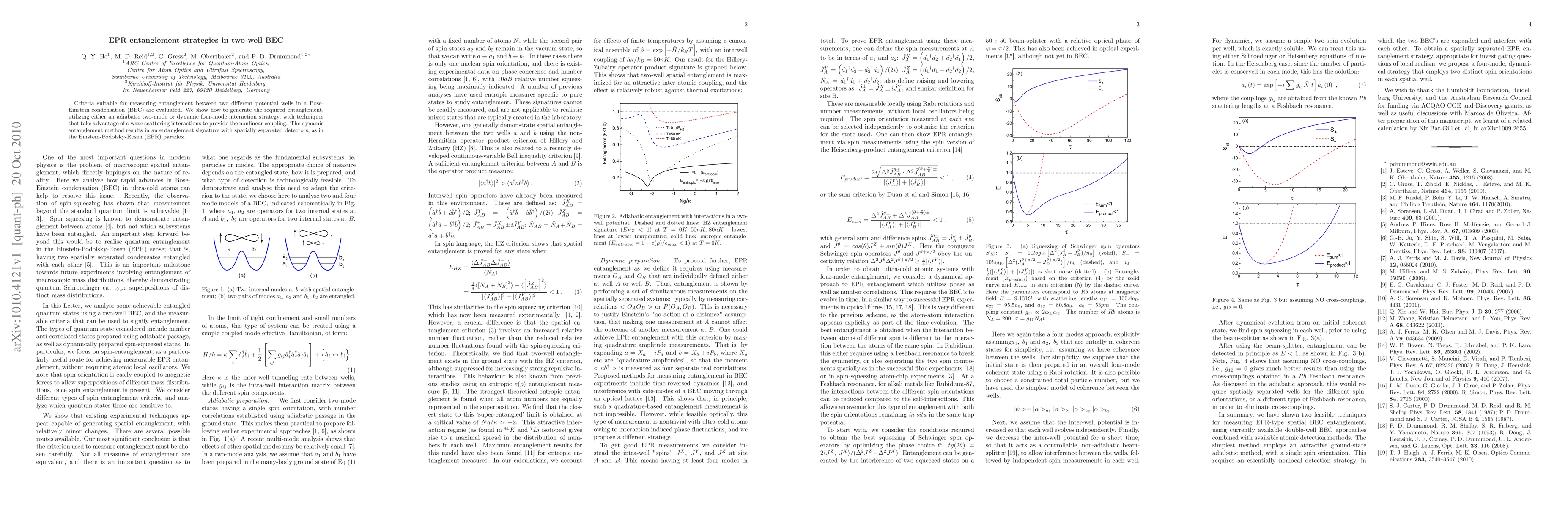 This paper evaluates criteria for measuring entanglement in a Bose-Einstein condensation (BEC) between two potential wells, demonstrating entanglement generation via adiabatic two-mode or dynamic four-mode interaction strategies, with the latter producing an EPR-like entanglement signature detectable by spatially separated detectors.