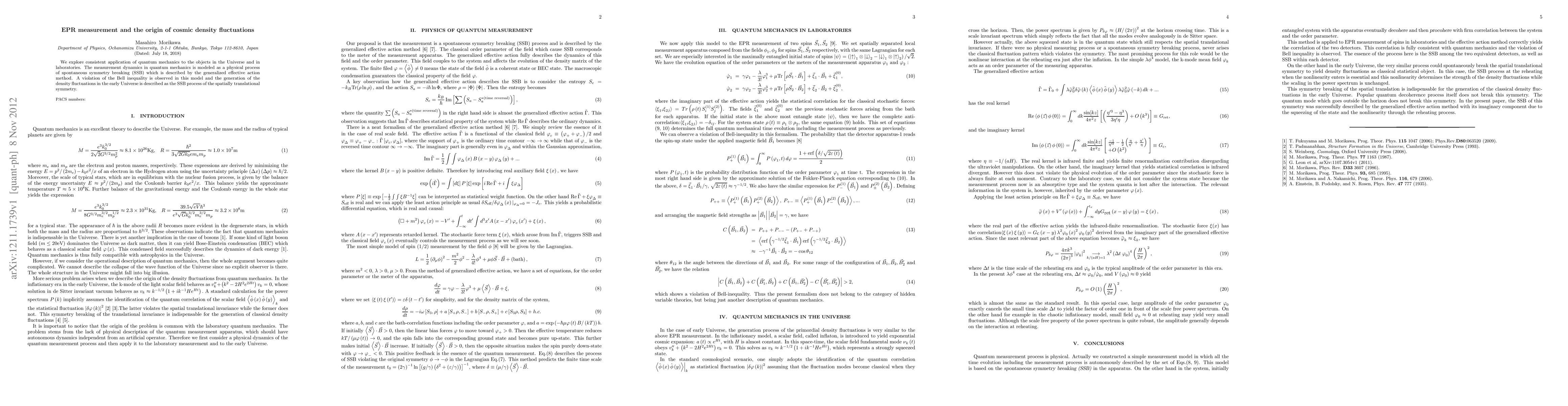 We explore consistent application of quantum mechanics to the objects in the Universe and in laboratories. The measurement dynamics in quantum mechanics is modeled as a physical process of spontaneous symmetry breaking (SSB) which is described by the generalized effective action method. A violation of the Bell inequality is observed in this model and the generation of the density fluctuations in the early Universe is described as the SSB process of the spatially translational symmetry.