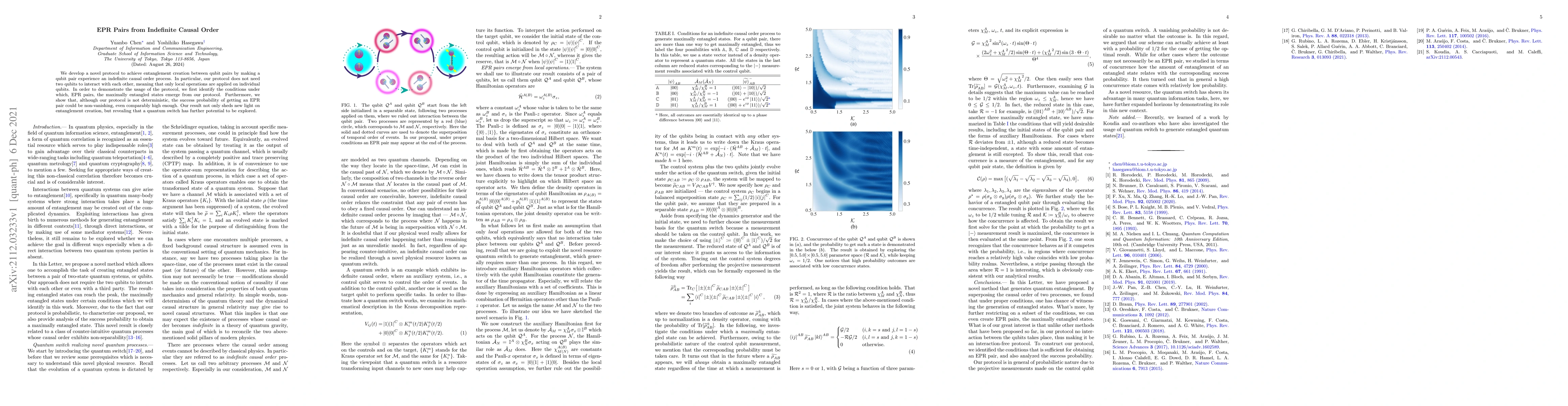 This paper proposes a protocol for creating EPR pairs through indefinite causal order without requiring direct interaction between qubits, relying solely on local operations. It demonstrates conditions for generating maximally entangled states and highlights the potential for high success probabilities, suggesting new avenues for entanglement creation and quantum switching.
