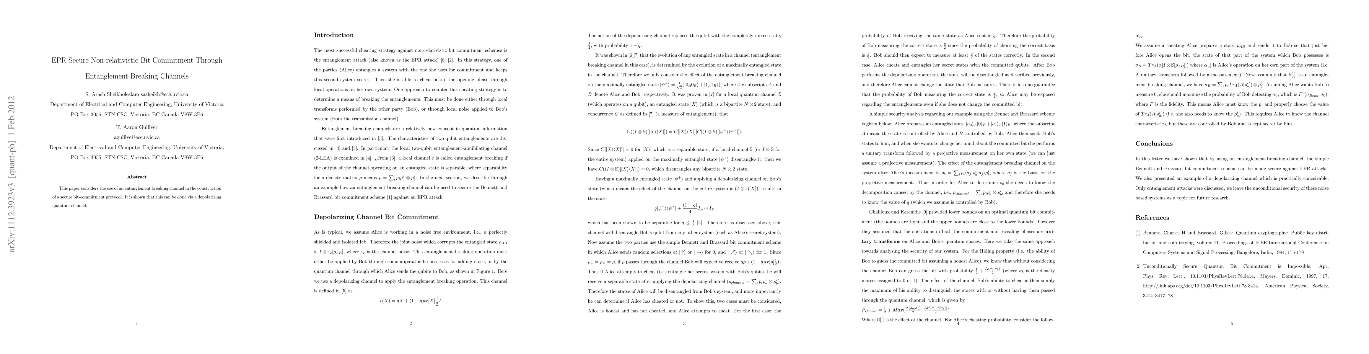 This paper considers the use an entanglement breaking channel in the construction of a secure bit-commitment protocol. It is shown that this can be done via a depolarizing quantum channel.