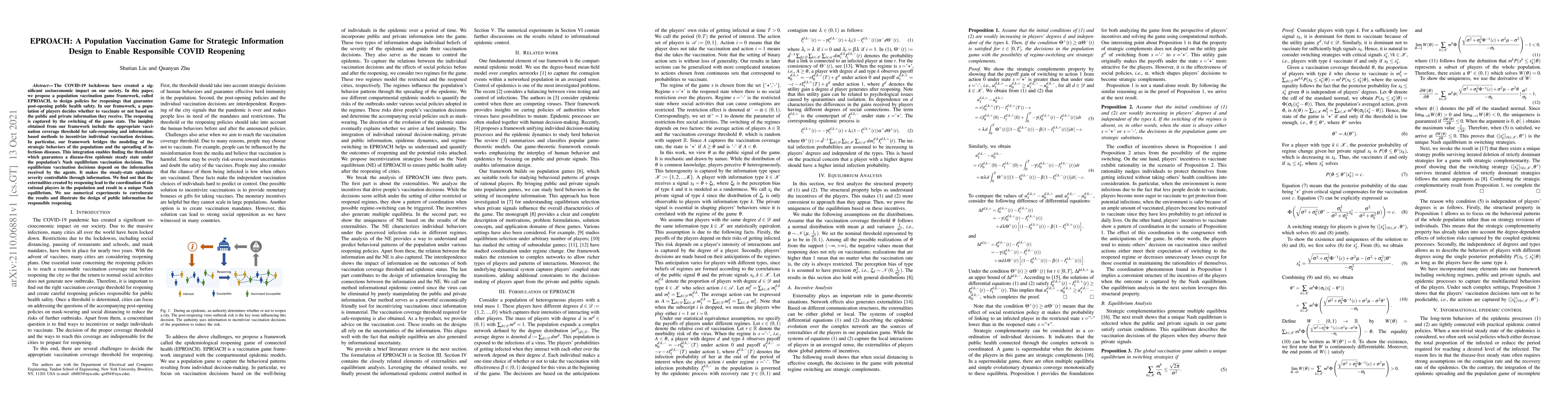 The EPROACH framework proposes a population vaccination game to design policies for safe COVID-19 reopening, determining the vaccination coverage threshold for public health safety and incentivizing individual vaccination through strategic information design. Numerical experiments validate the model's ability to control epidemic severity via information-driven vaccination decisions.