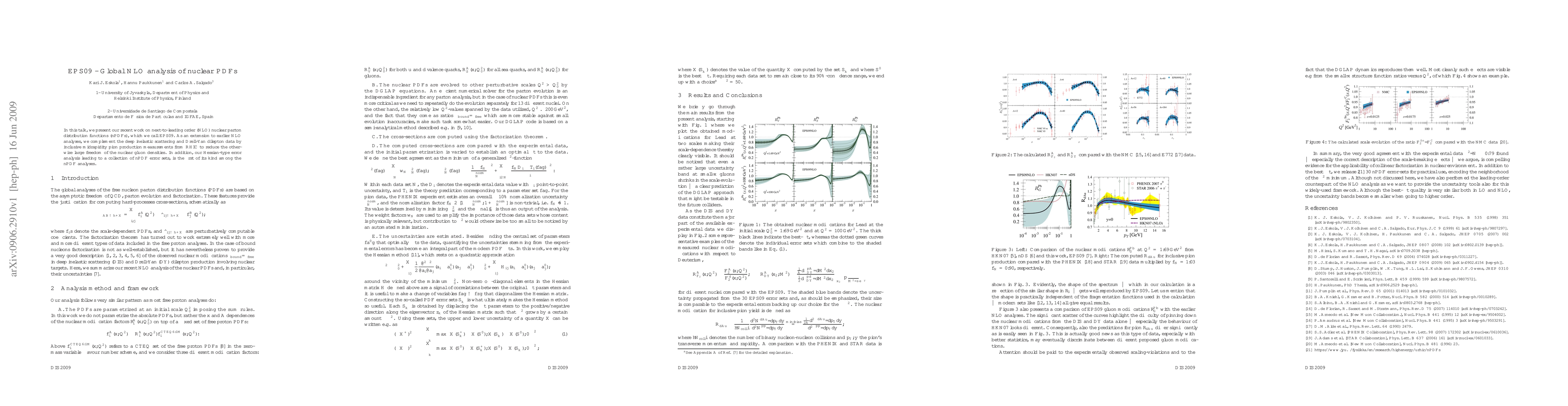 This paper introduces EPS09, an advanced next-to-leading order analysis of nuclear parton distribution functions, incorporating RHIC pion production data to refine gluon density estimates. It also presents a novel Hessian-type error analysis to generate a comprehensive set of nPDF error sets.