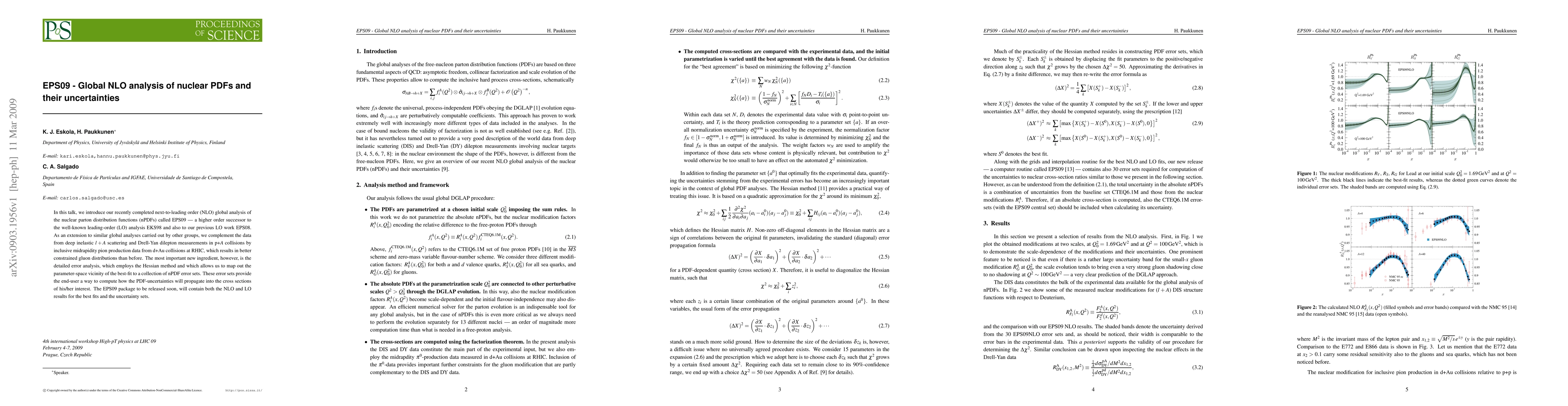 This paper presents the EPS09 global next-to-leading order analysis of nuclear parton distribution functions (nPDFs), improving upon previous leading-order analyses. It incorporates new data from RHIC and provides a detailed error analysis using the Hessian method, enabling users to assess PDF-uncertainty propagation in their calculations.