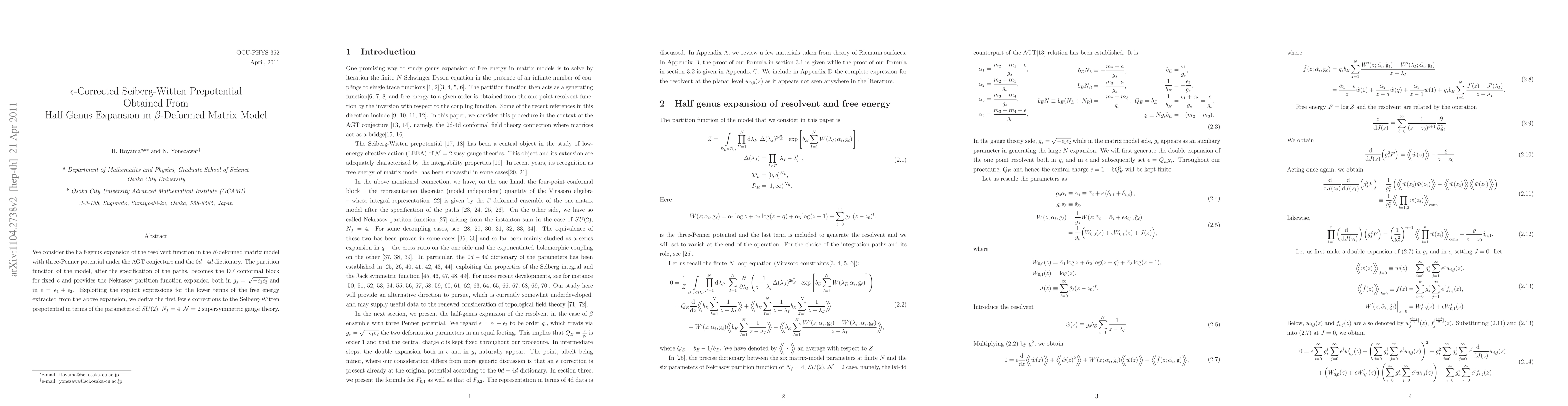 Summary: This paper derives the first few $\epsilon$-corrections to the Seiberg-Witten prepotential from the half-genus expansion in a $\beta$-deformed matrix model, leveraging the AGT conjecture and $0d-4d$ dictionary to connect the matrix model's partition function to the DF conformal block and the Nekrasov partition function.