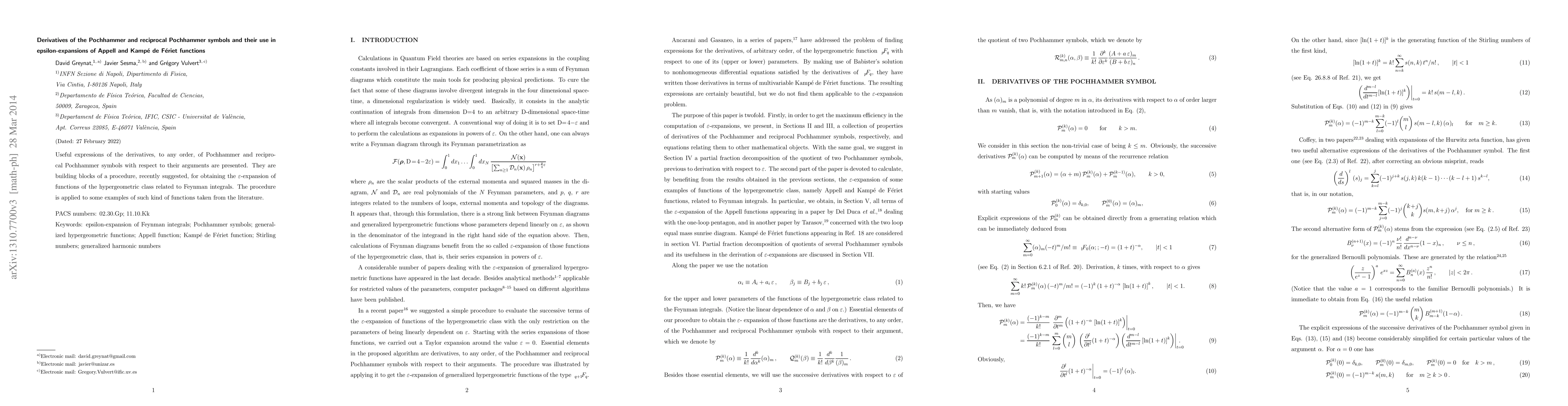 The decomposition in partial fractions of the quotient of Pochhammer symbols improves considerably a method, suggested in a precedent paper, which allows one to obtain the $\varepsilon$-expansion of functions of the hypergeometric class. The procedure is applied to several Appell and Kamp\'e de F\'eriet functions considered in the literature. Explicit expressions and interesting properties of the derivatives of the Pochhammer and reciprocal Pochhammer symbols, which are essential elements in the procedure, are given in an appendix.
