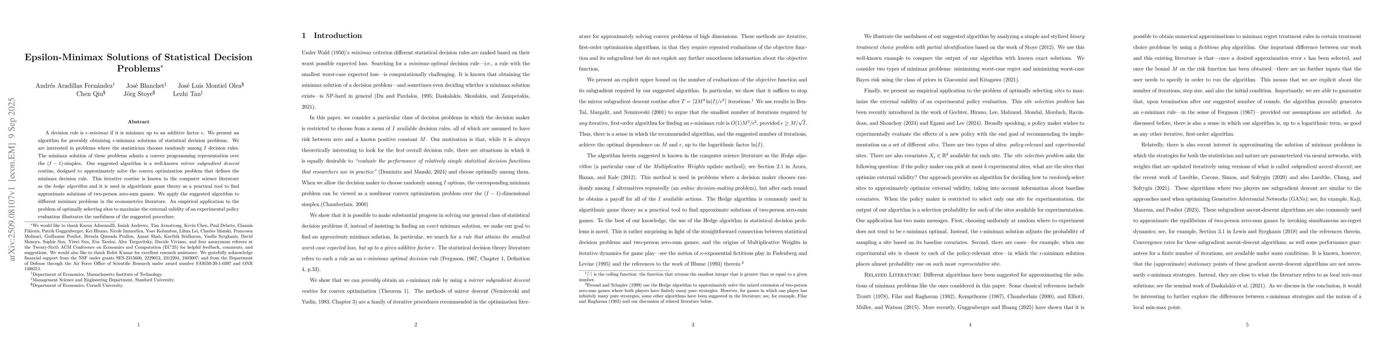 A decision rule is epsilon-minimax if it is minimax up to an additive factor epsilon. We present an algorithm for provably obtaining epsilon-minimax solutions of statistical decision problems. We are interested in problems where the statistician chooses randomly among I decision rules. The minimax solution of these problems admits a convex programming representation over the (I-1)-simplex. Our suggested algorithm is a well-known mirror subgradient descent routine, designed to approximately solve the convex optimization problem that defines the minimax decision rule. This iterative routine is known in the computer science literature as the hedge algorithm and it is used in algorithmic game theory as a practical tool to find approximate solutions of two-person zero-sum games. We apply the suggested algorithm to different minimax problems in the econometrics literature. An empirical application to the problem of optimally selecting sites to maximize the external validity of an experimental policy evaluation illustrates the usefulness of the suggested procedure.