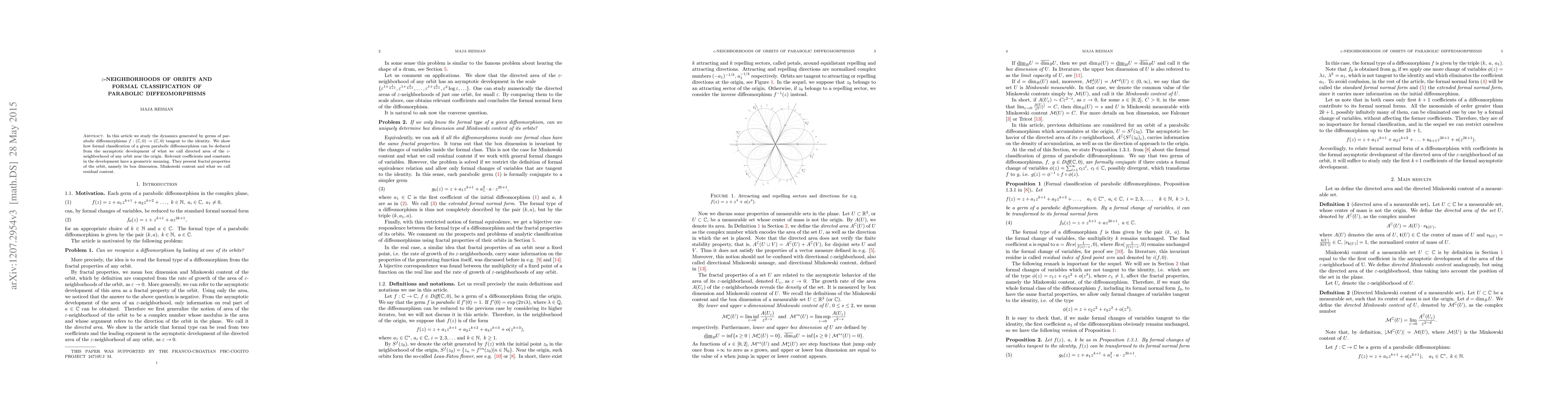 In this article we study the dynamics generated by germs of parabolic diffeomorphisms f : (C; 0)->(C; 0) tangent to the identity. We show how formal classification of a given parabolic diffeomorphism can be deduced from the asymptotic development of what we call directed area of the epsilon-neighborhood of any orbit near the origin. Relevant coefficients and constants in the development have a geometric meaning. They present fractal properties of the orbit, namely its box dimension, Minkowski content and what we call residual content.