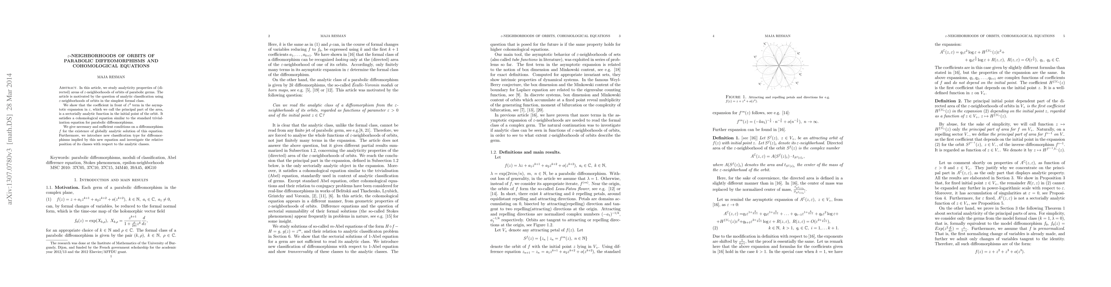 This paper explores the analytic properties of epsilon-neighborhoods of orbits of parabolic diffeomorphisms, demonstrating that the principal part of the area is a sectorially analytic function. It also establishes a cohomological equation for these areas and provides conditions for the existence of globally analytic solutions, introducing a new classification type for diffeomorphisms.