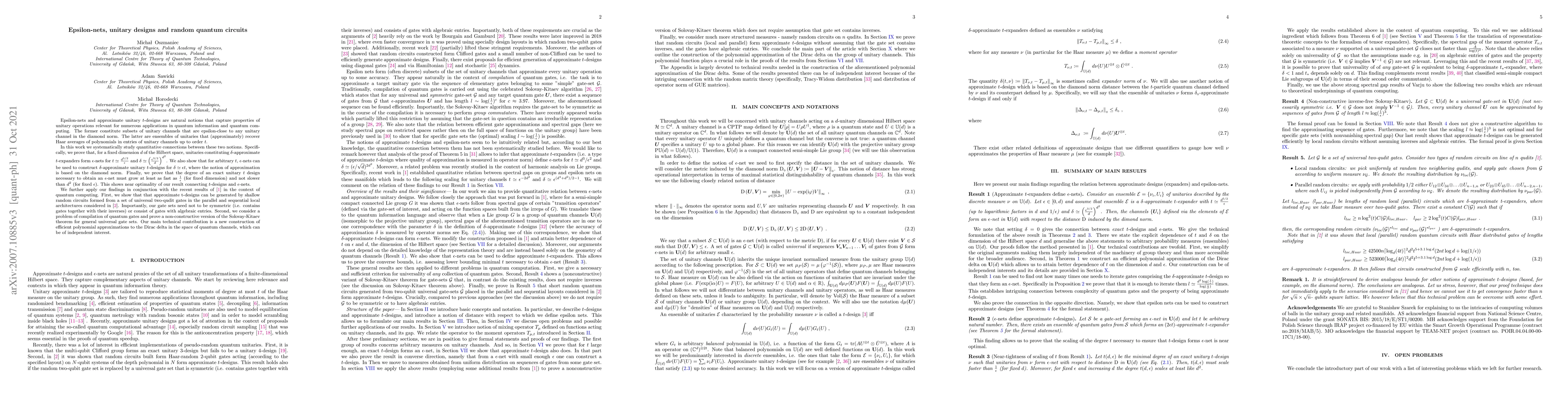 This paper establishes quantitative links between epsilon-nets and approximate unitary $t$-designs in quantum computing, showing that $\delta$-approximate $t$-expanders form $\epsilon$-nets for specific dimensions and parameters. It also demonstrates that shallow random circuits using universal two-qudit gates can generate approximate $t$-designs, and introduces a non-constructive version of the Solovay-Kitaev theorem for general gate sets.