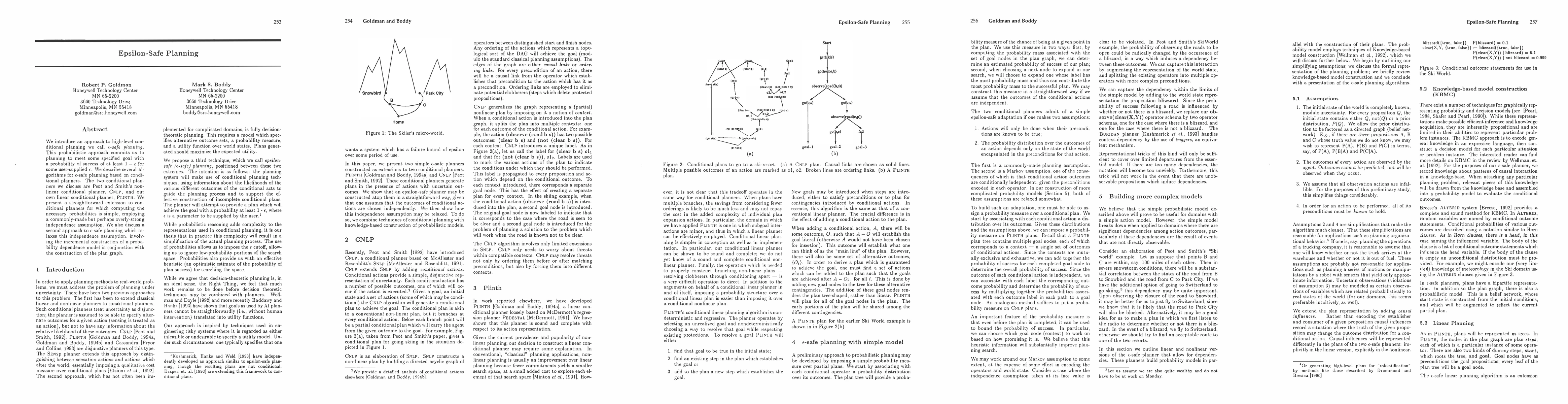 We introduce an approach to high-level conditional planning we call epsilon-safe planning. This probabilistic approach commits us to planning to meet some specified goal with a probability of success of at least 1-epsilon for some user-supplied epsilon. We describe several algorithms for epsilon-safe planning based on conditional planners. The two conditional planners we discuss are Peot and Smith's nonlinear conditional planner, CNLP, and our own linear conditional planner, PLINTH. We present a straightforward extension to conditional planners for which computing the necessary probabilities is simple, employing a commonly-made but perhaps overly-strong independence assumption. We also discuss a second approach to epsilon-safe planning which relaxes this independence assumption, involving the incremental construction of a probability dependence model in conjunction with the construction of the plan graph.