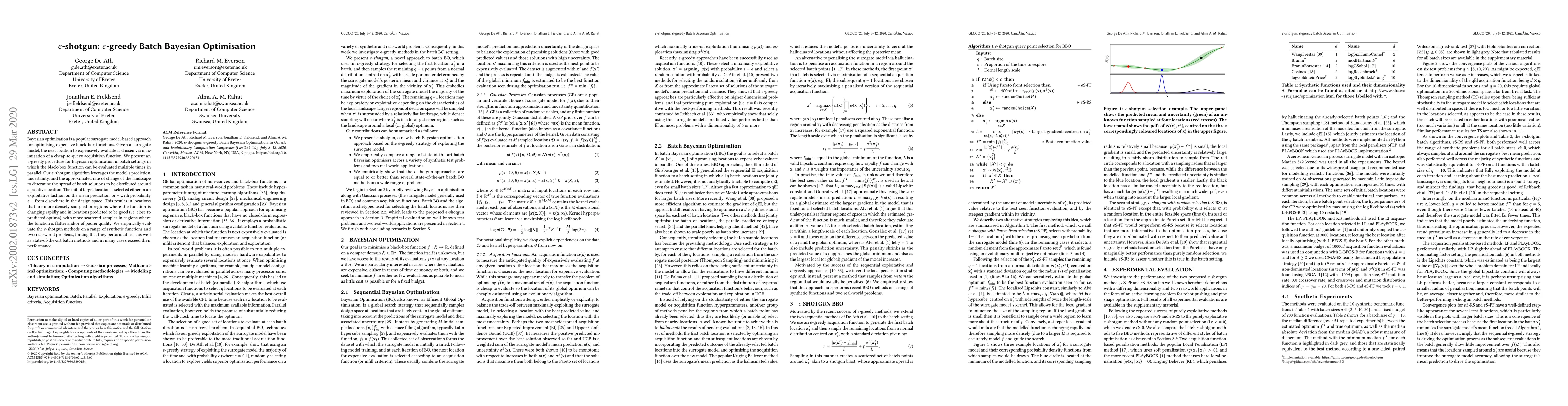 The $\epsilon$-shotgun algorithm introduces an $\epsilon$-greedy procedure for batch Bayesian optimisation, balancing exploitation and exploration to efficiently sample regions of interest in the design space. Empirical results show it outperforms or matches the performance of state-of-the-art batch methods on various synthetic and real-world problems.