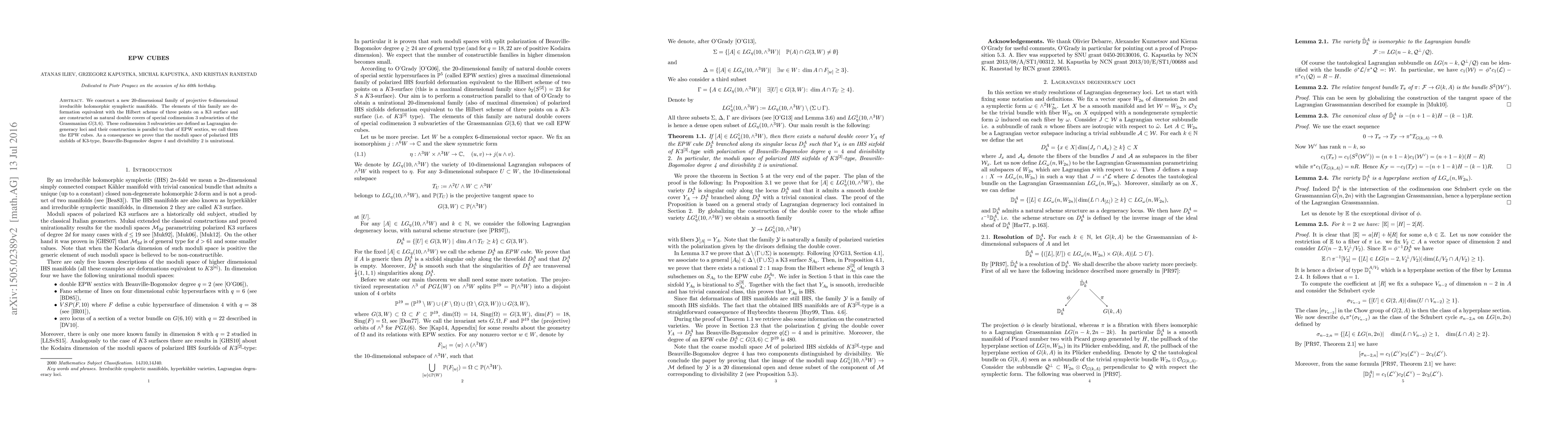 Summary: The paper constructs a new 20-dimensional family of 6-dimensional irreducible holomorphic symplectic manifolds, termed EPW cubes, which are deformation equivalent to the Hilbert scheme of three points on a K3 surface. It also proves that the moduli space of certain polarized IHS sixfolds is unirational.