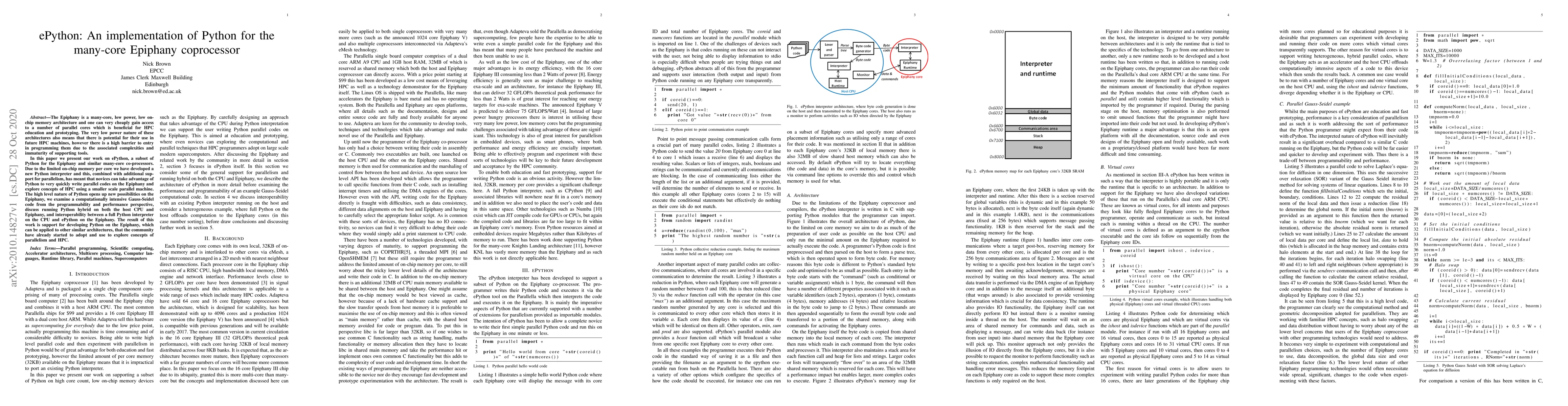 This paper introduces ePython, a subset of Python tailored for the Epiphany many-core coprocessor, aiming to lower the programming barrier for HPC education and prototyping. The authors developed a new Python interpreter to accommodate the limited on-chip memory, enabling novices to write parallel codes efficiently and explore HPC concepts on a smaller scale parallel machine.