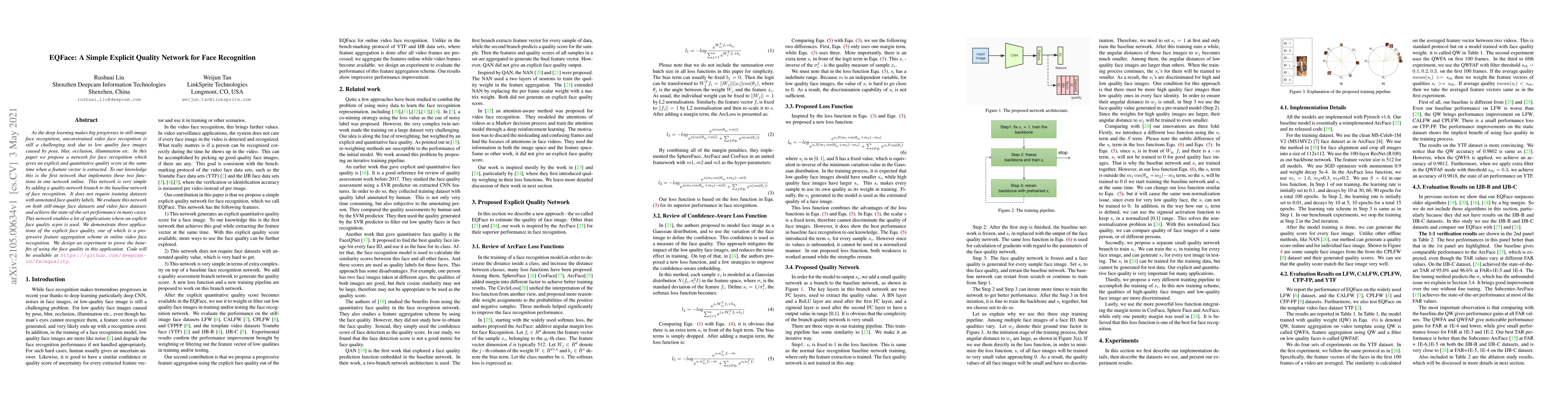 EQFace introduces a simple yet effective network for face recognition that simultaneously extracts feature vectors and provides an explicit quality score for faces. This dual-function network achieves state-of-the-art performance in both still-image and video face recognition, enabling applications that benefit from explicit face quality assessments.