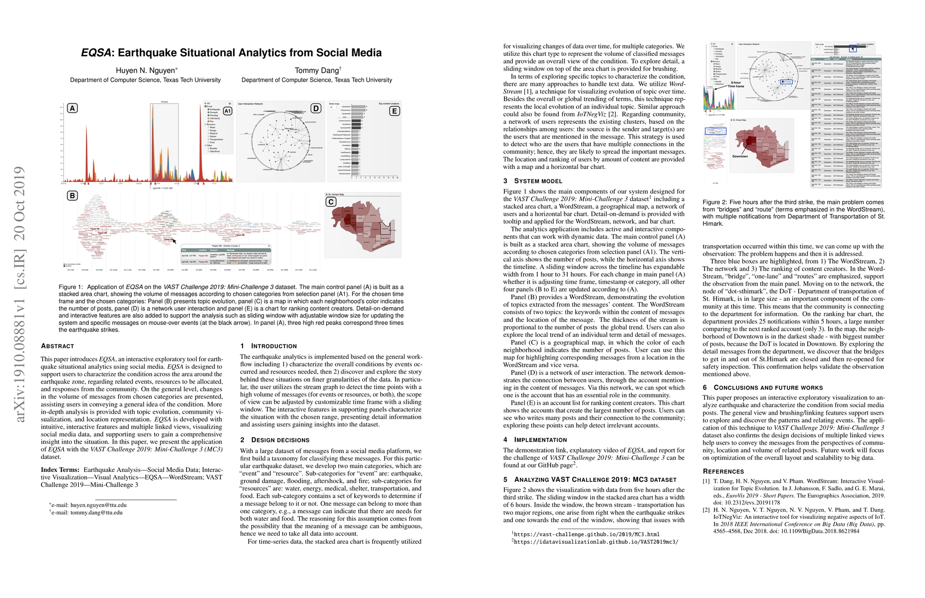 EQSA is an interactive tool for earthquake situational analytics using social media, designed to characterize conditions around earthquake zones by analyzing event-related messages, resource allocation, and community responses. It provides comprehensive insights through intuitive visualizations and linked views of social media data.
