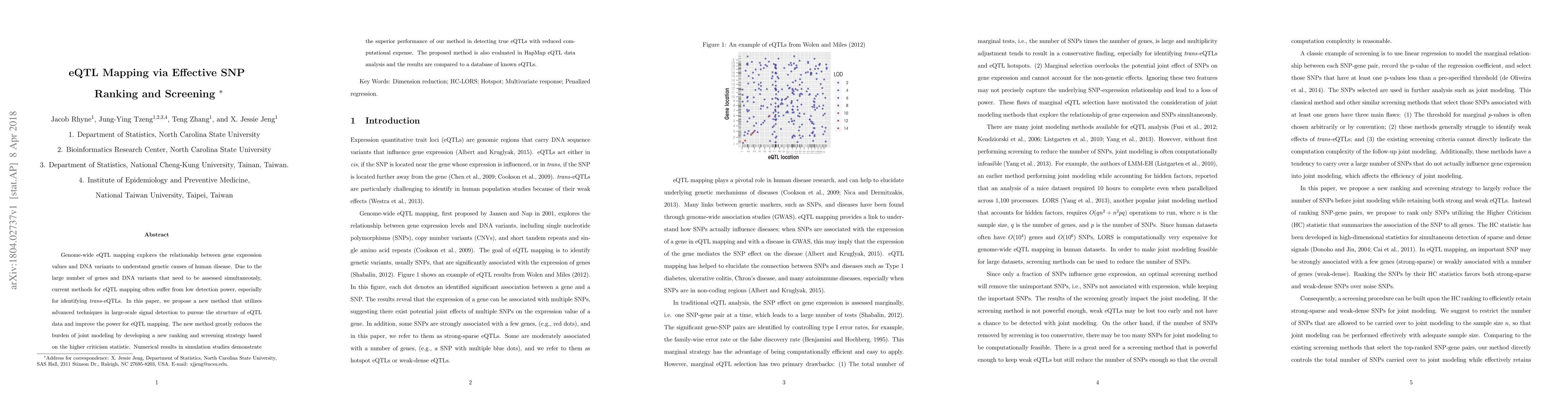 This paper introduces a novel method for eQTL (expression Quantitative Trait Loci) mapping, addressing low detection power in identifying disease-related genetic variants. The approach uses a ranking and screening strategy based on the higher criticism statistic to reduce computational burden, demonstrating superior performance in simulations and real HapMap data analysis.
