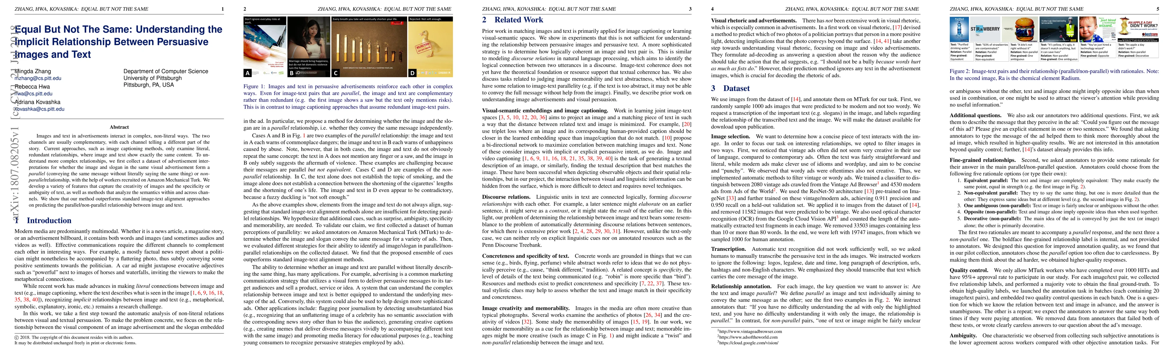 Images and text in advertisements interact in complex, non-literal ways. The two channels are usually complementary, with each channel telling a different part of the story. Current approaches, such as image captioning methods, only examine literal, redundant relationships, where image and text show exactly the same content. To understand more complex relationships, we first collect a dataset of advertisement interpretations for whether the image and slogan in the same visual advertisement form a parallel (conveying the same message without literally saying the same thing) or non-parallel relationship, with the help of workers recruited on Amazon Mechanical Turk. We develop a variety of features that capture the creativity of images and the specificity or ambiguity of text, as well as methods that analyze the semantics within and across channels. We show that our method outperforms standard image-text alignment approaches on predicting the parallel/non-parallel relationship between image and text.
