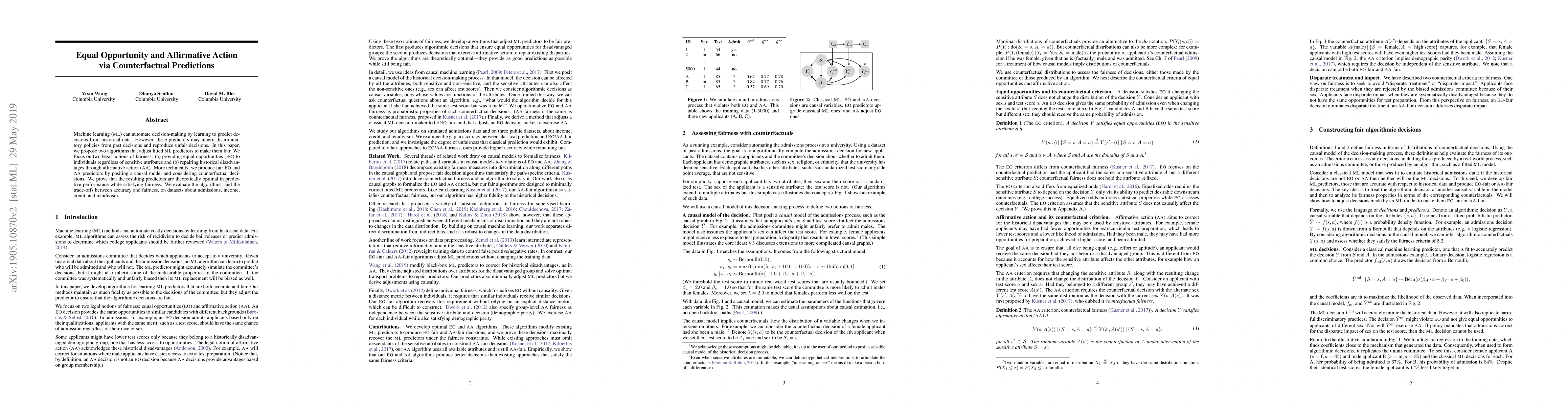 This paper proposes algorithms to adjust machine learning predictors to ensure equal opportunity and affirmative action by considering counterfactual decisions. The algorithms aim to maintain optimal predictive performance while addressing historical discrimination, evaluated on datasets related to admissions, income, credit, and recidivism.