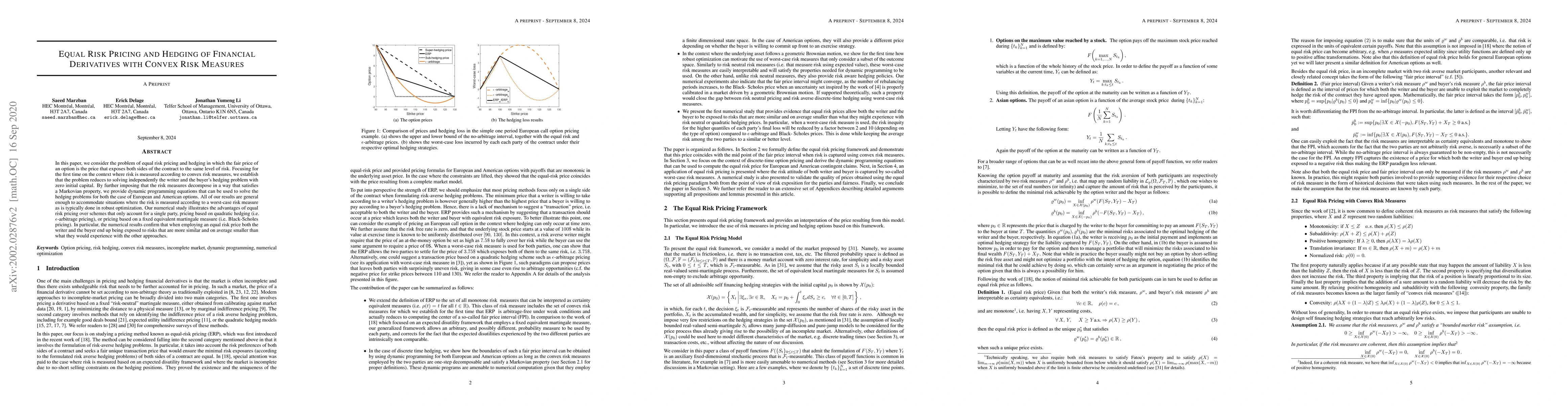 In this paper, we consider the problem of equal risk pricing and hedging in which the fair price of an option is the price that exposes both sides of the contract to the same level of risk. Focusing for the first time on the context where risk is measured according to convex risk measures, we establish that the problem reduces to solving independently the writer and the buyer's hedging problem with zero initial capital. By further imposing that the risk measures decompose in a way that satisfies a Markovian property, we provide dynamic programming equations that can be used to solve the hedging problems for both the case of European and American options. All of our results are general enough to accommodate situations where the risk is measured according to a worst-case risk measure as is typically done in robust optimization. Our numerical study illustrates the advantages of equal risk pricing over schemes that only account for a single party, pricing based on quadratic hedging (i.e. $\epsilon$-arbitrage pricing), or pricing based on a fixed equivalent martingale measure (i.e. Black-Scholes pricing). In particular, the numerical results confirm that when employing an equal risk price both the writer and the buyer end up being exposed to risks that are more similar and on average smaller than what they would experience with the other approaches.